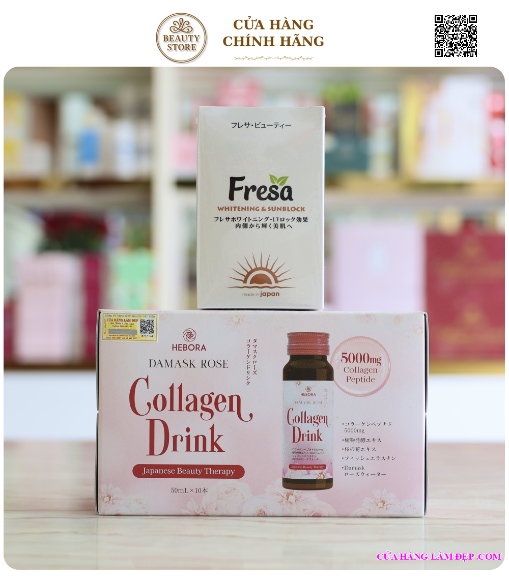 Hebora Collagen Drink: Chai 500ml; Viên uống Fresa: Hộp 60 viên