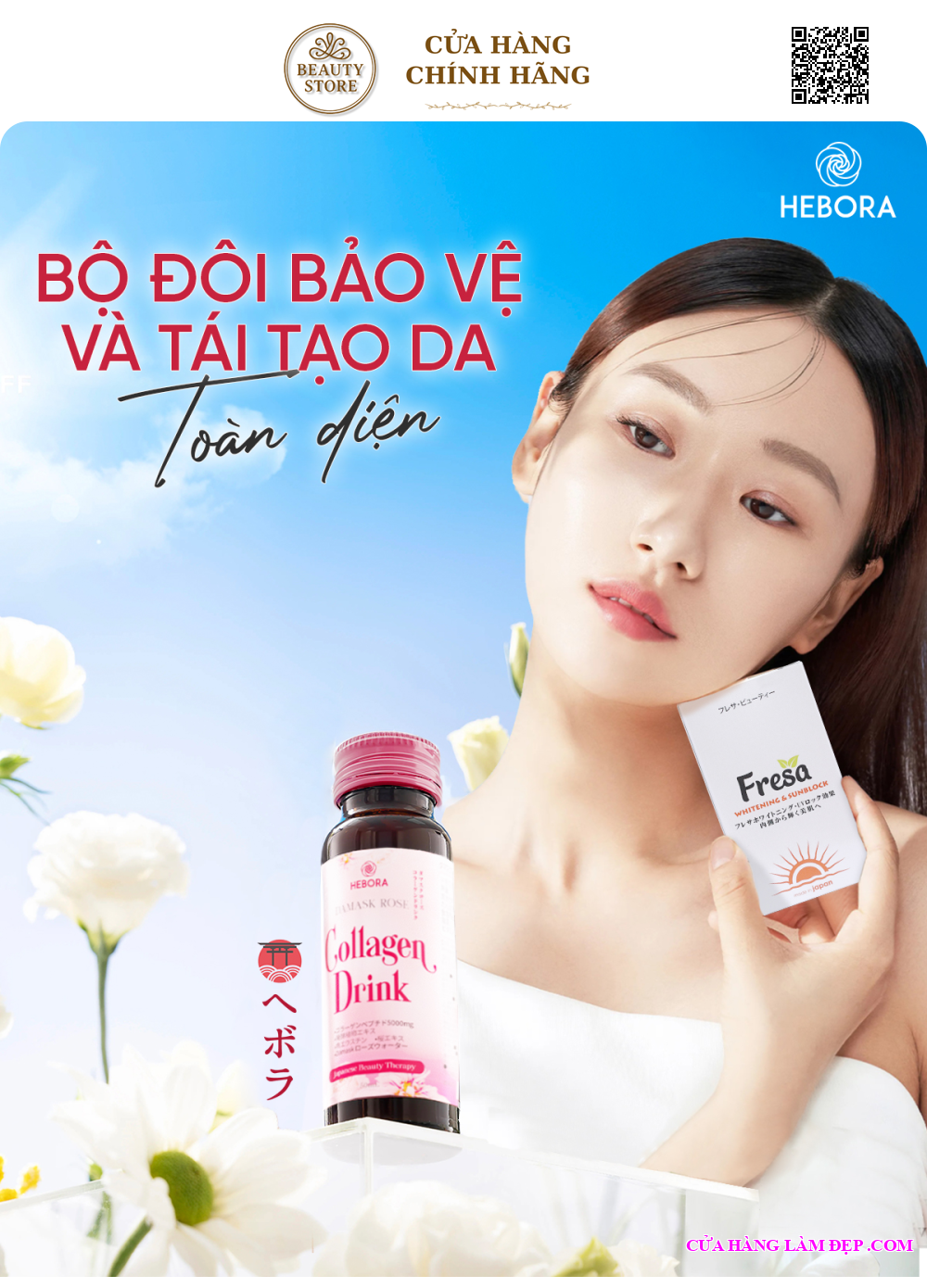 Một làn da cháy nắng xỉn màu, một cơ thể thiếu sức sống. Đã đến lúc phục hồi, trả lại làn da tươi tắn, căng bóng và mịn màng với combo sản phẩm Hebora Collagen Drink và viên uống dưỡng trắng & chống nắng Fresa.