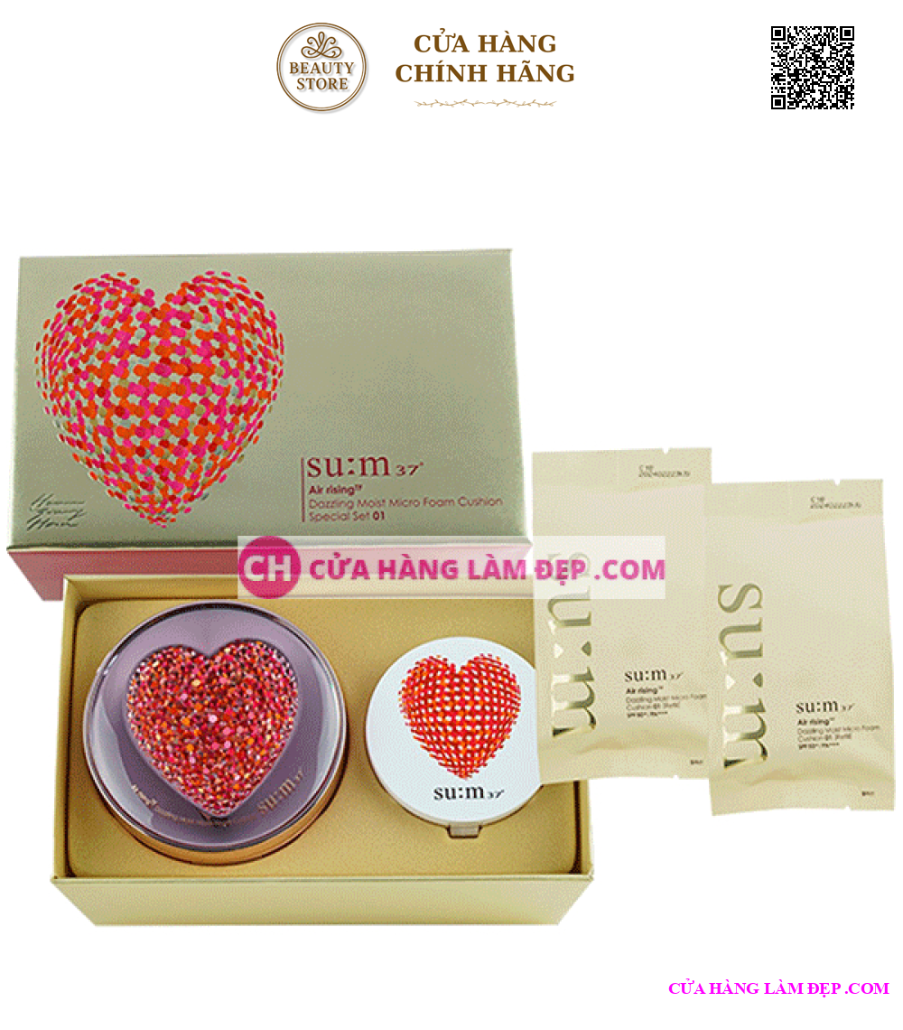 – Là phiên bản cải tiến, tăng cường dưỡng chất cho làn da mịn mượt căng bóng. Với mẫu thiết hình trái tim lấp lánh đẹp mĩ miều, màu cực kỳ lãng mạn mát mắt giúp tạo ra cho bạn cảm giác yêu thương ấm áp, sảng khoái mỗi khi dùng hay ngắm nhìn tác phẩm mới này của dòng phấn ướt Sum. Set Phấn Nước Đa Năng Su:m37 Air Rising TF Dazzling Moist Micro Foam Cushion SPF50/ PA+++ Special Set sẽ là sản phẩm cho bạn cảm giác tự nhiên nhất.