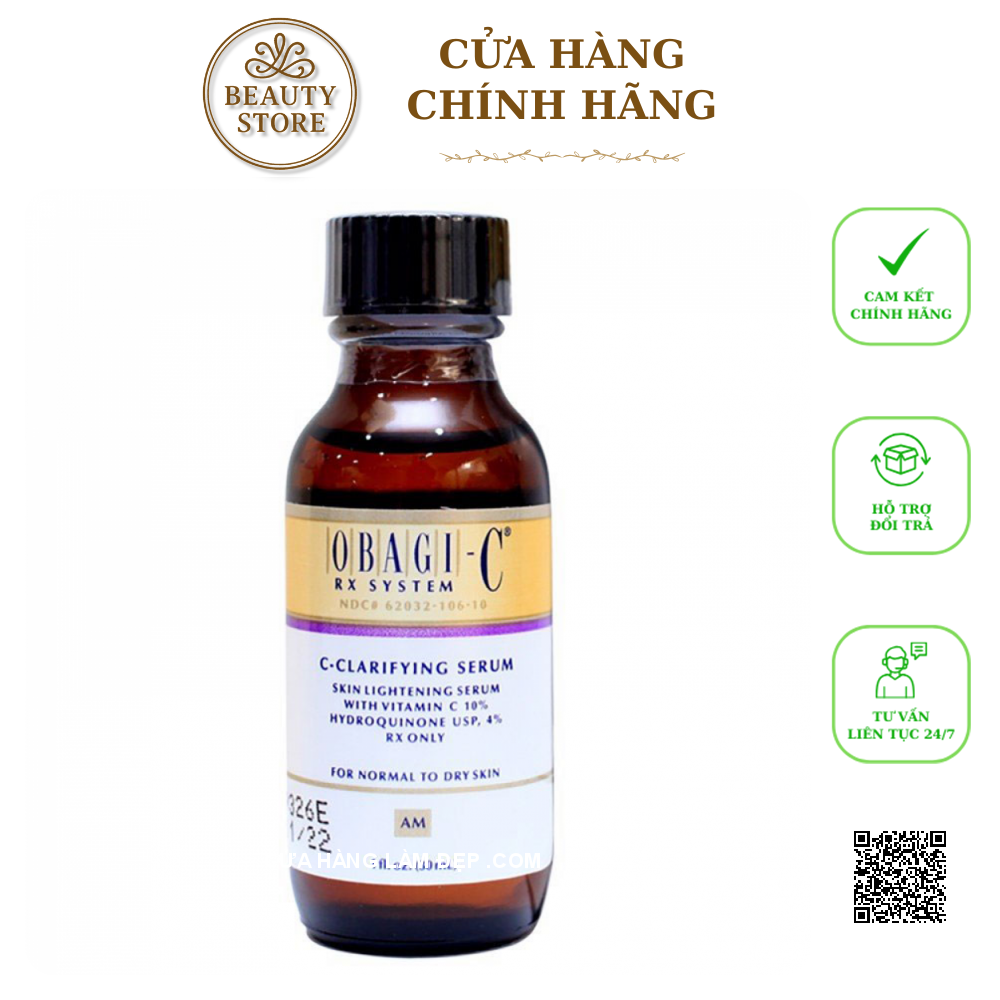 Serum làm trắng da, Hỗ Trợ Ngừa Lão Hóa Obagi-C Rx C-Clarifying Serum - Normal To Dry với thành phần chính là Vitamin C có Hydroquinone 4‰, sản phẩm sẽ giúp cân bằng màu sắc của da, làm cho da sáng trắng và rạng rỡ hơn, đồng thời giúp da săn chắc hơn.