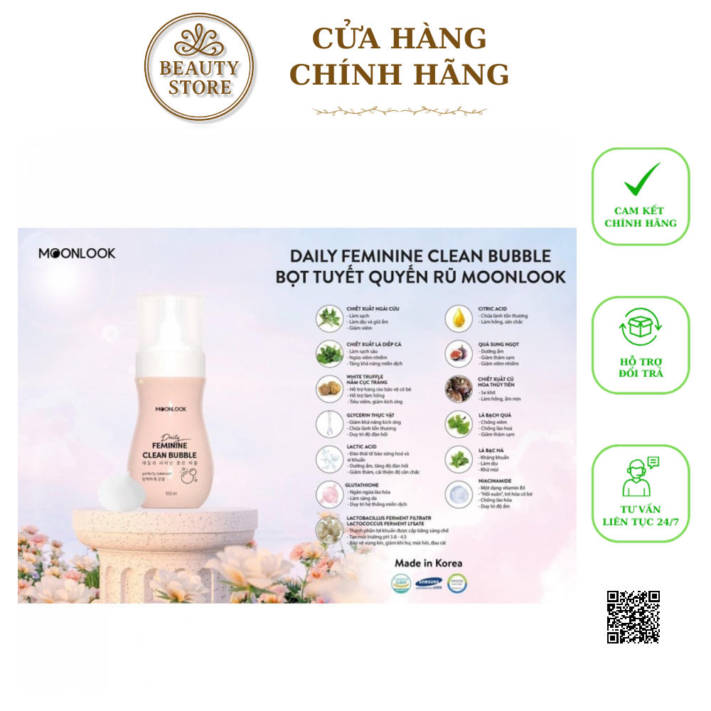 - Bọt tuyết quyến rũ MoonLook là dung dịch vệ sinh đặc biệt dạng bọt tuyết, nhập khẩu 100% từ Hàn Quốc, có tác dụng làm sạch “cô bé” một cách nhẹ nhàng, ngăn ngừa vi khuẩn, cân bằng môi trường pH, hỗ trợ điều trị viêm nhiễm và khử mùi hôi hiệu quả.