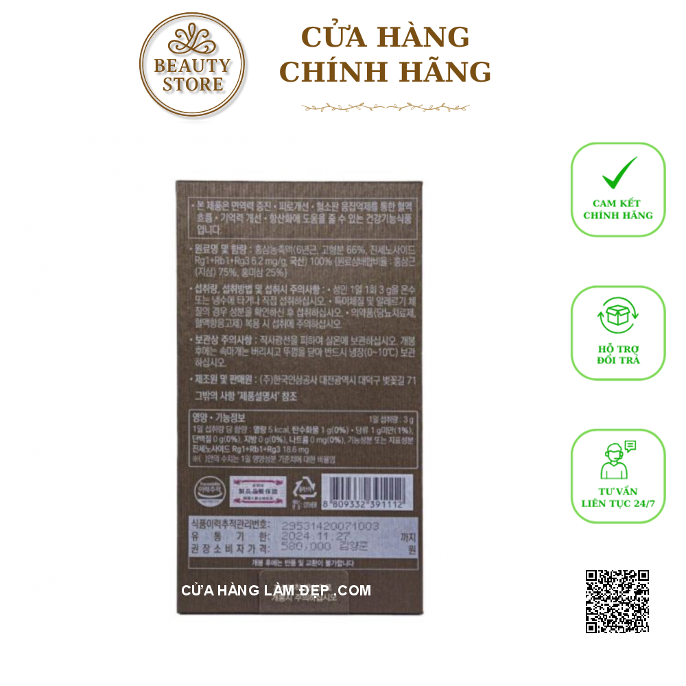 Hồng sâm cô đặc (6 tuổi, hàm lượng chất rắn 66%, ginsenoside Rg1+Rb1+Rg3 6,2 mg/g, sản xuất Hàn Quốc) 100% (tỷ lệ pha trộn nhân sâm thô: rễ nhân sâm đỏ (nhân sâm đất) 75%, nhân sâm đỏ 25%).
