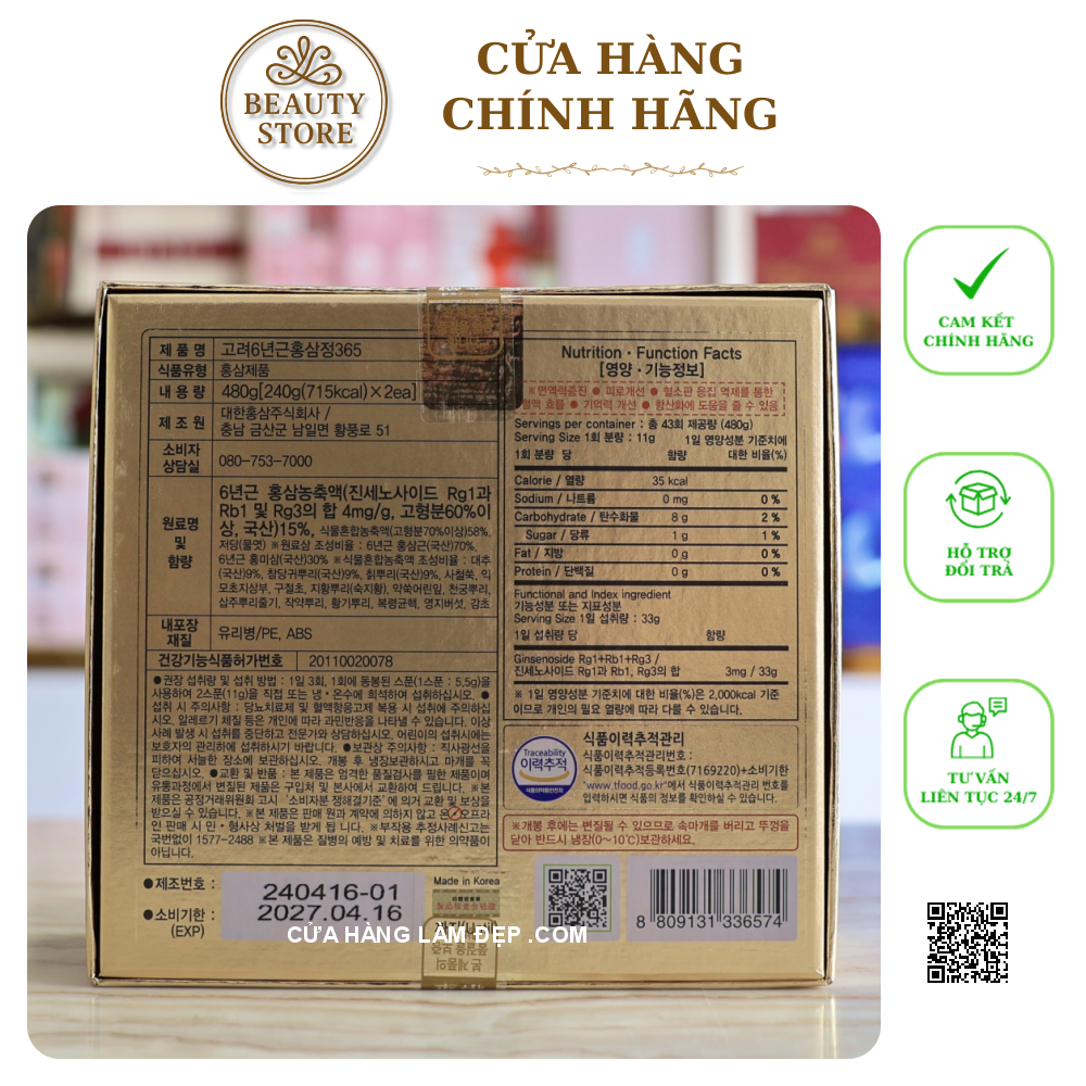Cao Hồng Sâm 365 (240g X 2 Lọ) là sản phẩm chức năng được tinh chế chủ yếu từ Hồng Sâm Hàn Quốc 6 năm tuổi, tập trung được tối đa các dược tính có nhân sâm. Sản phẩm còn được bổ sung thêm các loại thảo dược thiên nhiên quý khác như linh chi, bạch chỉ, xuyên khung… Trải qua quá trình chưng cất nhiều lần, áp dụng kỹ thuật bốc hơi chân không ở nhiệt độ thấp kết hợp cùng phương pháp chế biến truyền thống của người Hàn Quốc giúp cho thành dược tính Hồng Sâm được tăng lên, mang đến công dụng hiệu quả hơn.