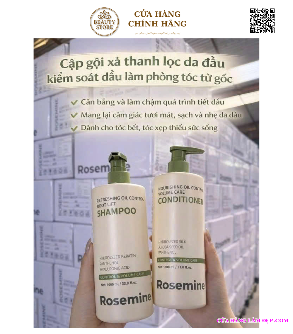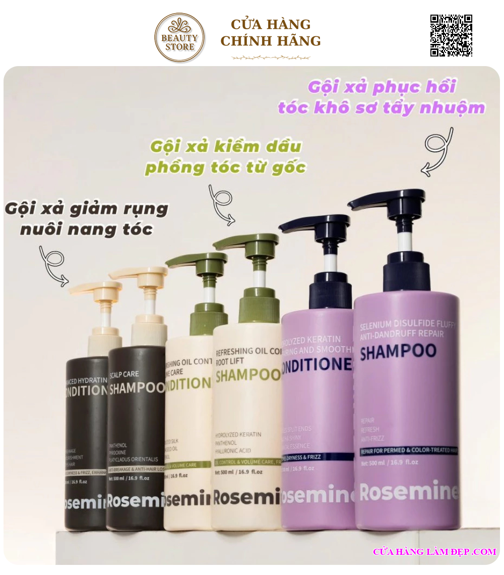Cặp dầu gội xả Rosemine là dòng chăm sóc tóc chuyên sâu giúp phục hồi tóc hư tổn – giảm gãy rụng – dưỡng tóc suôn mượt và chắc khỏe. Sản phẩm phù hợp cho nhiều tình trạng tóc như tóc khô xơ, tóc dầu, tóc gãy rụng, với các phiên bản chuyên biệt theo từng nhu cầu.