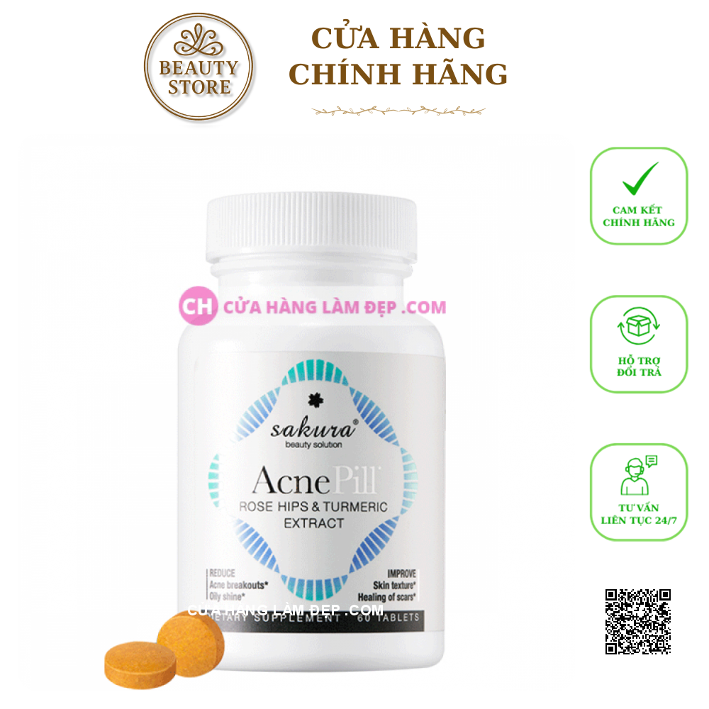 - Viên uống giảm mụn Sakura AcnePill: giúp bảo vệ da khỏi tác động từ các tia UV và cung cấp độ ẩm từ bên trong, tăng cường đề kháng cũng như sản sinh các Collagen mới cho da. Ngoài ra, trong sản phẩm viên uống AcnePill còn có các thành phần được chiết xuất từ tự nhiên như: Rose Hips extract và Curcumin extract. Các tinh chất này giúp làm hỗ trợ trẻ hóa làn da và đẩy nhanh quá trình tái tạo mới cho da.