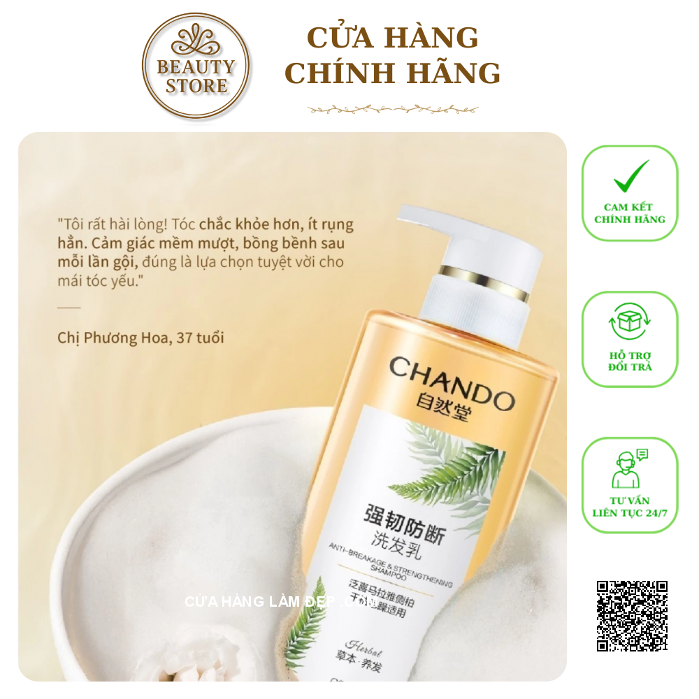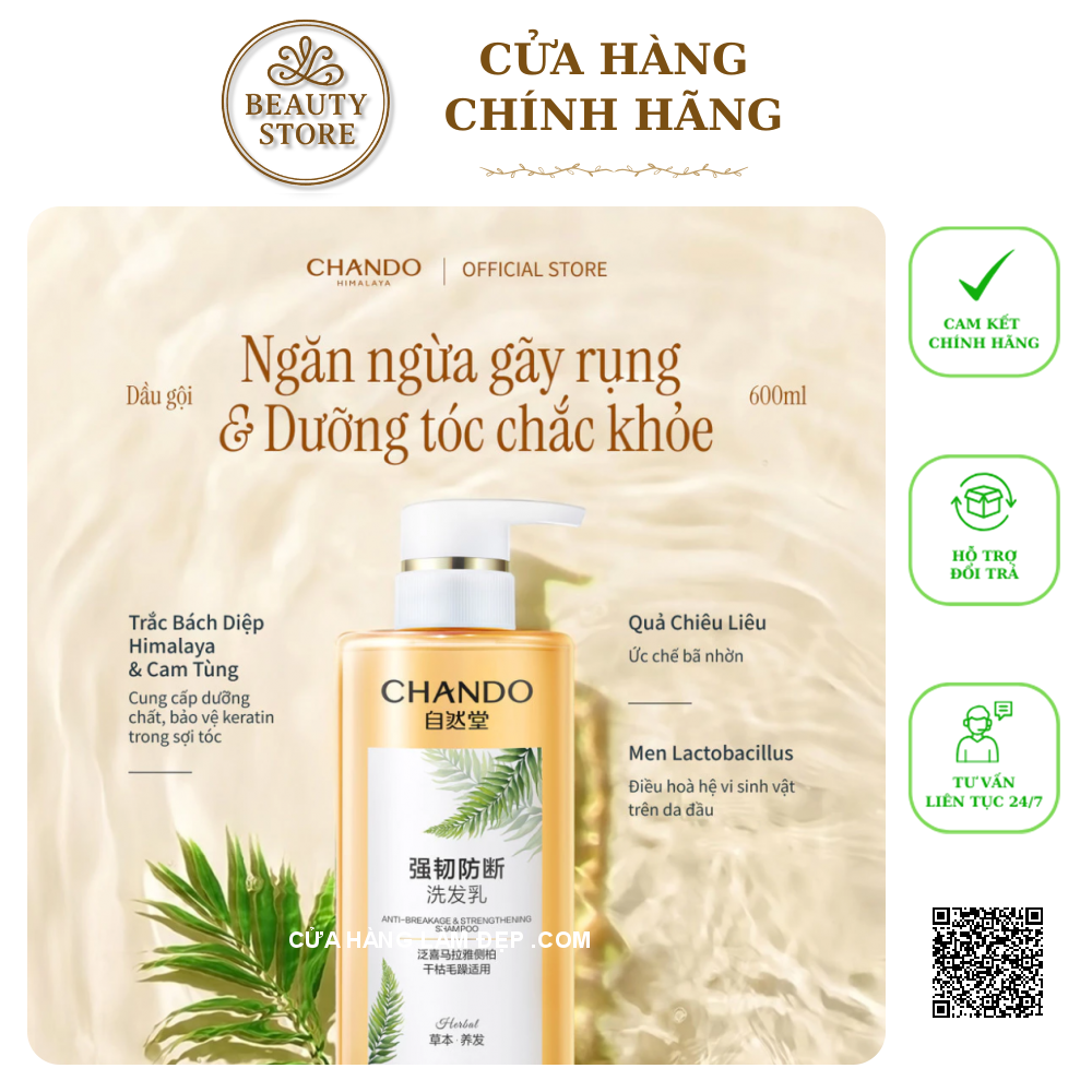 Dầu Gội Hỗ Trợ Giảm Gãy Rụng Dưỡng Tóc Chắc Khoẻ CHANDO Himalaya 600ml là sản phẩm chăm sóc tóc cao cấp đến từ thương hiệu CHANDO Himalaya – nổi tiếng với các dòng mỹ phẩm thiên nhiên lấy cảm hứng từ sự tinh khiết của dãy núi Himalaya. Với công thức dịu nhẹ, sản phẩm giúp làm sạch sâu da đầu, nuôi dưỡng chân tóc và giảm gãy rụng hiệu quả, mang lại mái tóc chắc khỏe, mềm mượt và đầy sức sống.