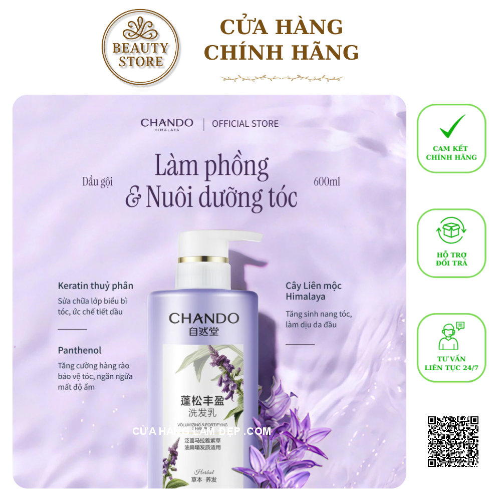 Dầu Gội Làm Phồng Nuôi Dưỡng Tóc Dày Và Chắc Khoẻ CHANDO Himalaya 600ml là sản phẩm chăm sóc tóc cao cấp đến từ thương hiệu CHANDO Himalaya – nổi tiếng với các dòng mỹ phẩm lấy cảm hứng từ sự tinh khiết và mạnh mẽ của thiên nhiên vùng núi Himalaya. Với công thức dịu nhẹ, sản phẩm giúp làm sạch sâu da đầu, kiểm soát dầu nhờn và nuôi dưỡng tóc từ gốc đến ngọn, mang lại mái tóc dày, chắc khỏe và bồng bềnh tự nhiên.