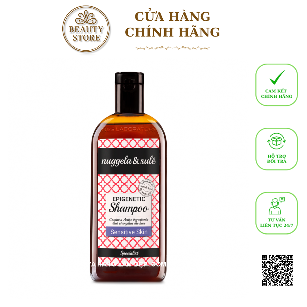 Dầu gội Nuggela & Sule Sensitive Skin Epigenetic Shampoo kết cấu dạng dung dịch sánh đặc màu vàng nâu nhạt dành cho da đầu nhạy cảm, dị ứng, viêm da. Giúp hỗ trợ ngừa dầu thừa, giúp bảo vệ tóc và da đầu, làm dịu da đầu.
