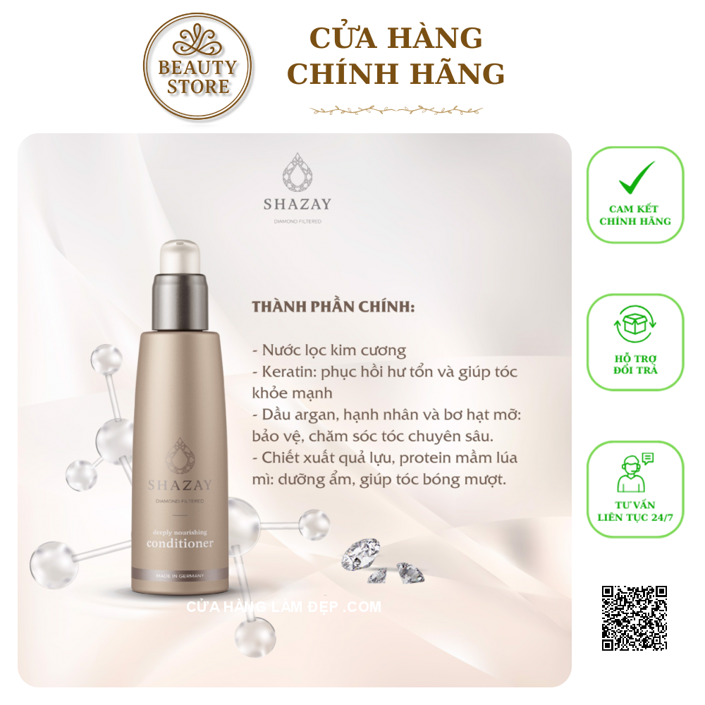 - Giàu dưỡng chất, tăng cường độ ẩm cho tóc: Dầu xả Shazay chăm sóc tóc chuyên sâu Deeply Nourishing là sự kết hợp giữa nước lọc kim cương cùng đa thành phần dưỡng chất mang đến liệu pháp dưỡng ẩm đặc biệt và chuyên sâu, giúp giảm xoăn cứng, tóc trở nên mềm mượt, dễ chải, bóng mịn tự nhiên.