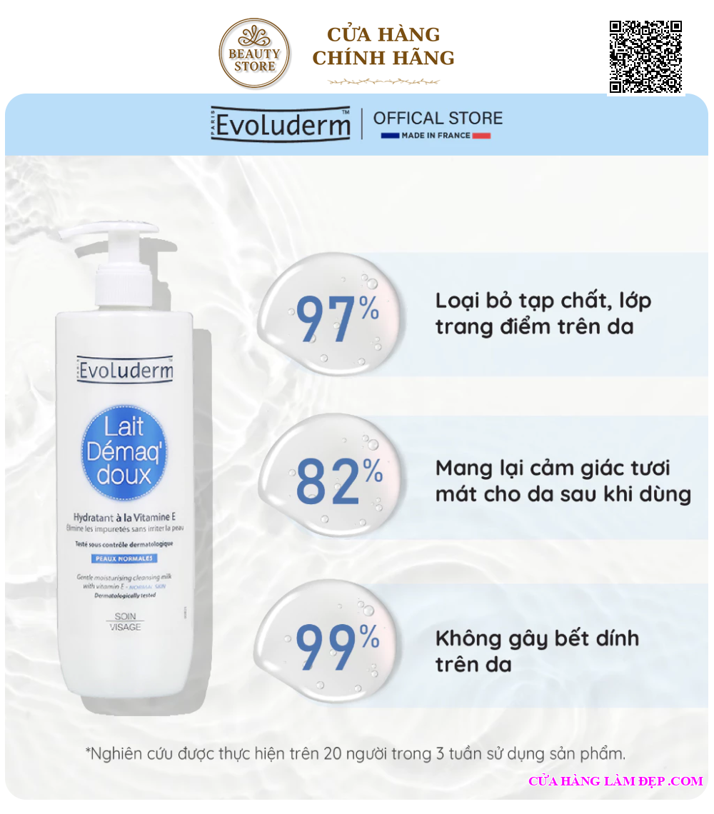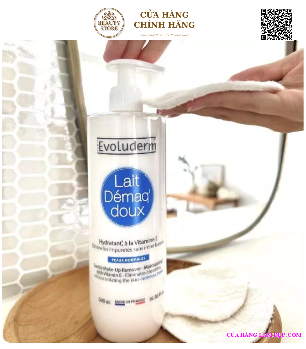 Tại hệ thống Cửa Hàng Làm Đẹp, sản phẩm Evoluderm Lait Demaq Doux Sữa Tẩy Trang Và Rửa Mặt Bổ Sung Vitamin E Dưỡng Ẩm Cho Làn Da Mịn Màng Tươi Mát Từ Pháp 500ml có giá 325.000 VNĐ