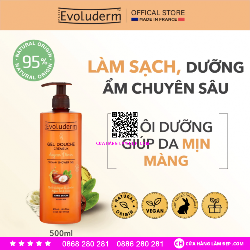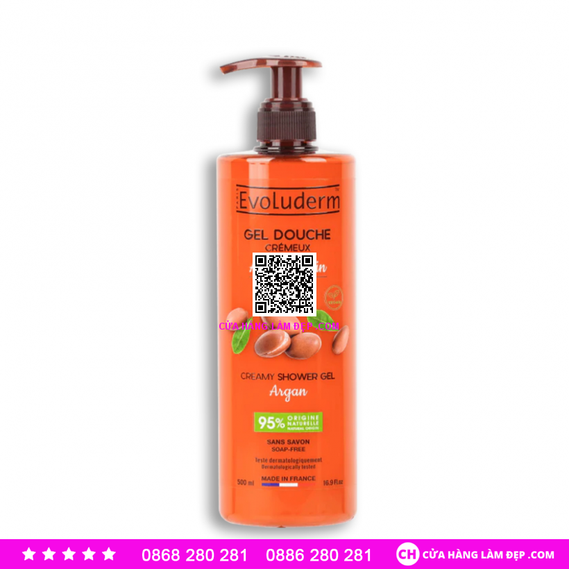 Tại hệ thống Cửa Hàng Làm Đẹp, sản phẩm Evoluderm Gel Tắm Argan and Karite 500ml từ Pháp có giá 225.000 VNĐ