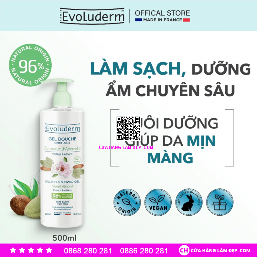 Tại hệ thống Cửa Hàng Làm Đẹp, sản phẩm Evoluderm Gel tắm Hạnh nhân có giá 1.079.000 VNĐ