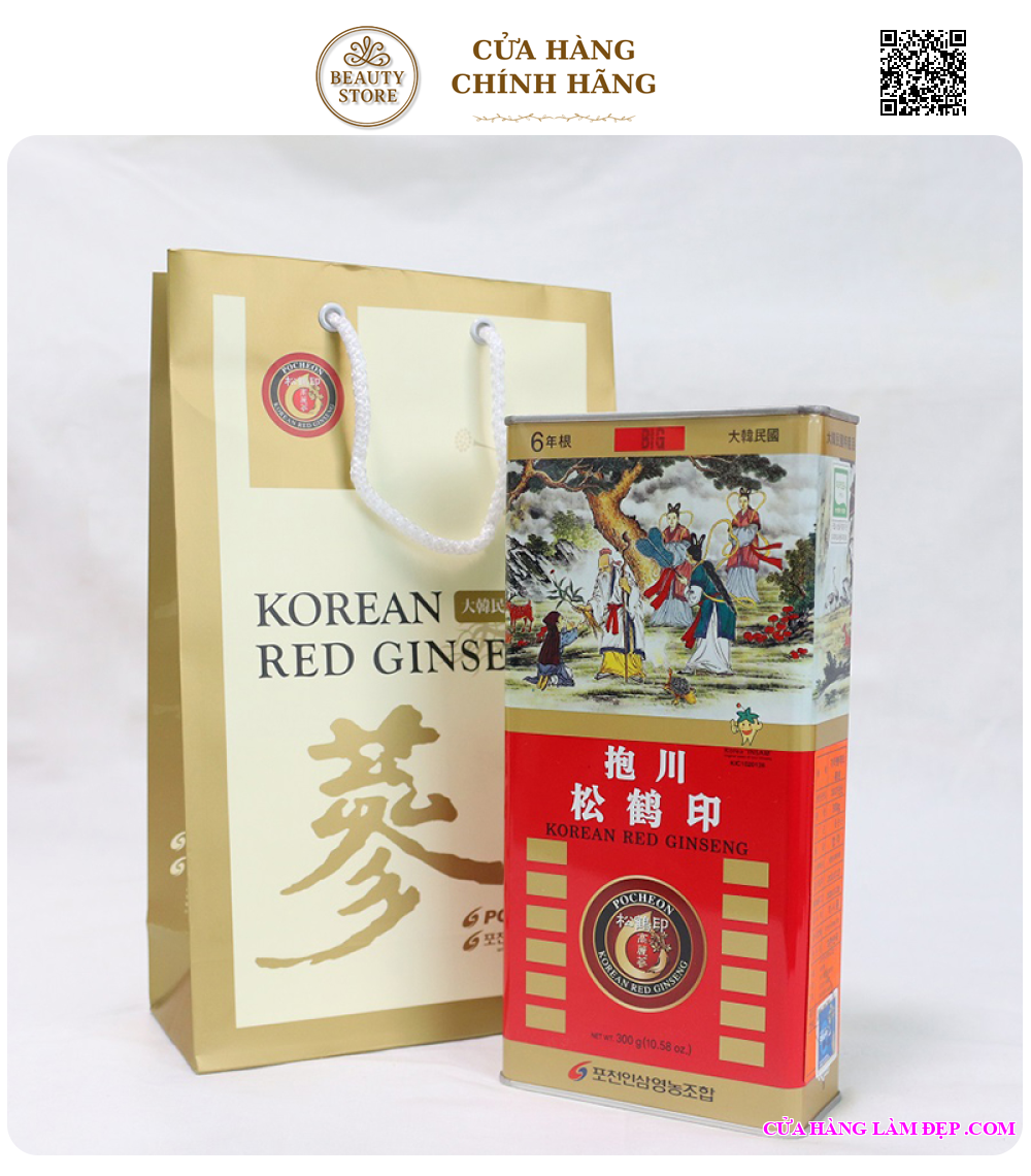 Hồng Sâm Củ Khô Pocheon Korean Red Ginseng Hộp Thiếc 300g được chọn lựa từ những củ sâm chất lượng đủ 6 năm tuổi, được sấy khô và đóng hộp thiếc bọc gỗ thông sang trọng. Hồng Sâm Hàn Quốc Củ Khô có tác dụng chống mệt mỏi, đồng thời tăng cường bồi bổ sức khỏe, sử dụng sâm củ khô hàn quốc thường xuyên có thể hỗ trợ kéo dài tuổi thọ và trí lực, giúp đầu óc minh mẫn, sảng khoái,đồng thời nâng cao hiệu quả năng lực làm việc, giúp cải thiện tình trạng mất ngủ, tăng khả năng ghi nhớ và năng lực phân tích.