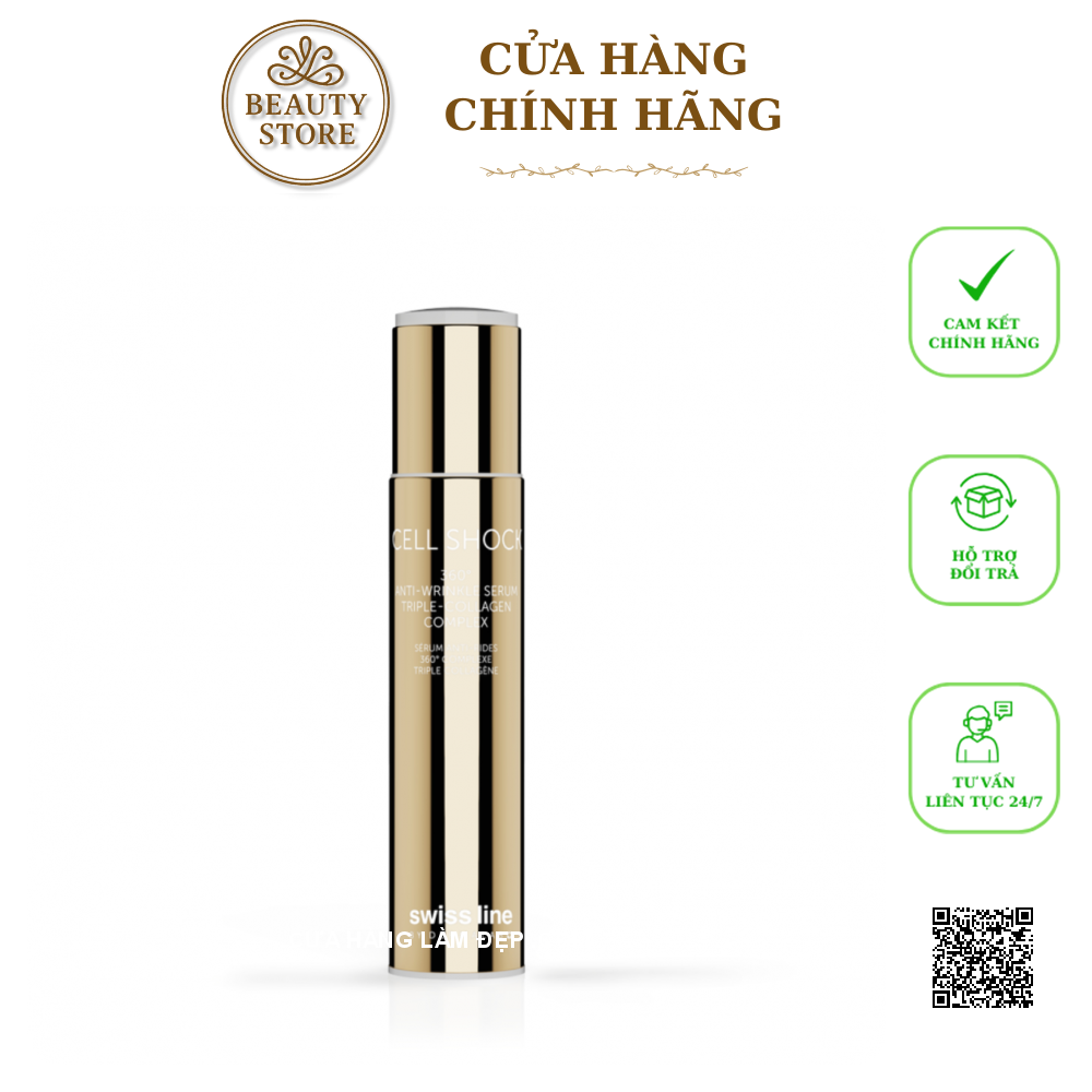Huyết Thanh Xóa Nhăn Swissline Cell Shock Anti-Wrinkle Serum Triple-Collagen Complex là thành tựu khoa học mới nhất dòng "Botox thoa thế hệ II" với cơ cấu làm phẳng nếp nhăn sâu hiệu quả và căng da toàn diện, có khả năng thẩm thấu sâu vào từng lớp sừng để phục hồi lại khả năng đàn hồi và săn chắc tự nhiên của da, ngăn chặn sự hủy hoại, thiếu hụt Collagen, thúc đẩy hỗ trợ trẻ hóa và làm đầy Tinh chất theo cơ chế căng da tự nhiên và tuyệt đối an toàn cho làn da.
