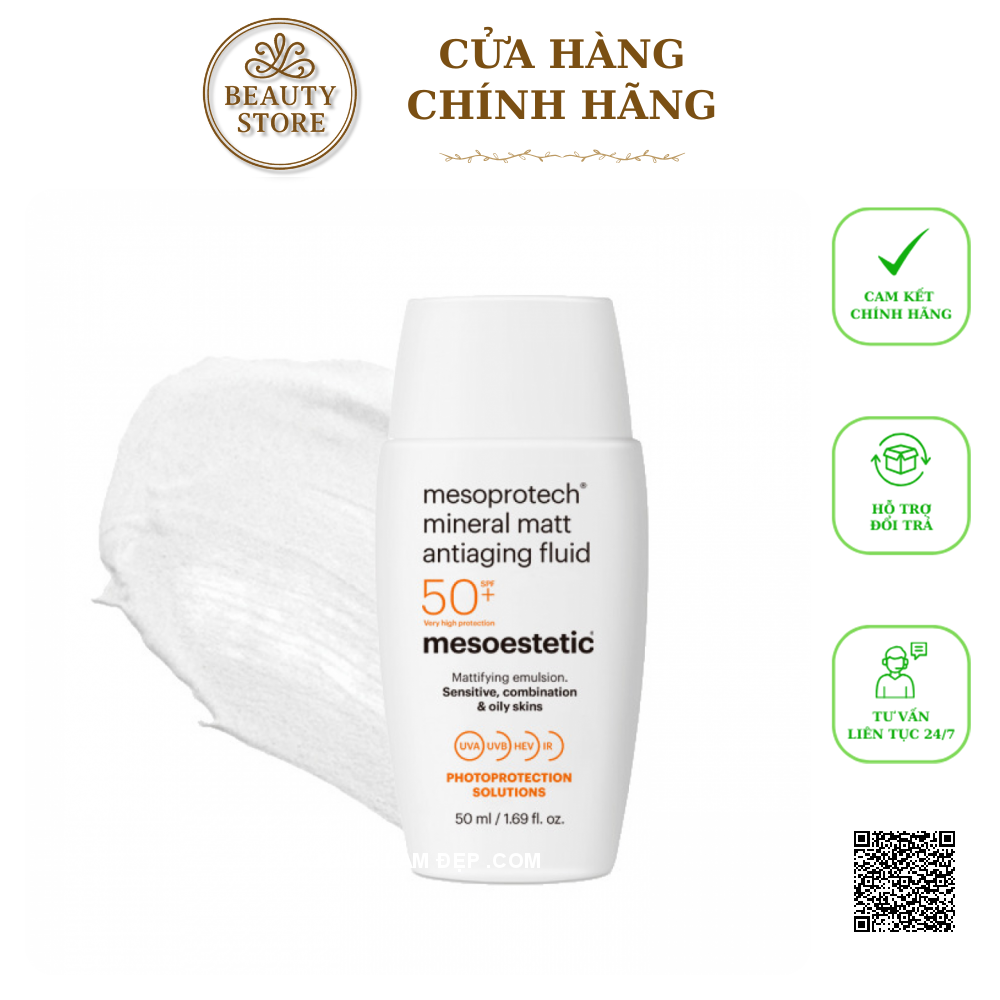 Kem hỗ trợ Hỗ Trợ Chống Nắng Mesoestetic Mineral Matt Antiaging Fluid Mesoprotech SPF50+ Cho Da Nhạy Cảm ứng dụng công nghệ hỗ trợ Hỗ Trợ Chống nắng bằng “Mesoestetic Complex” – phức hợp hỗ trợ Hỗ Trợ Chống nắng phổ rộng giúp bảo vệ làn da hoàn hảo trước sự tấn công của tia cực tím UVA/UVB, ánh sáng nhìn thấy (HEV) và bức xạ hồng ngoại (IR). Nhờ đó, ngăn chặn những thương tổn trên da gây ra do tia UV như nám sạm, tàn nhang, nếp nhăn... bảo vệ làn da sáng mịn và tươi trẻ với thời gian.
