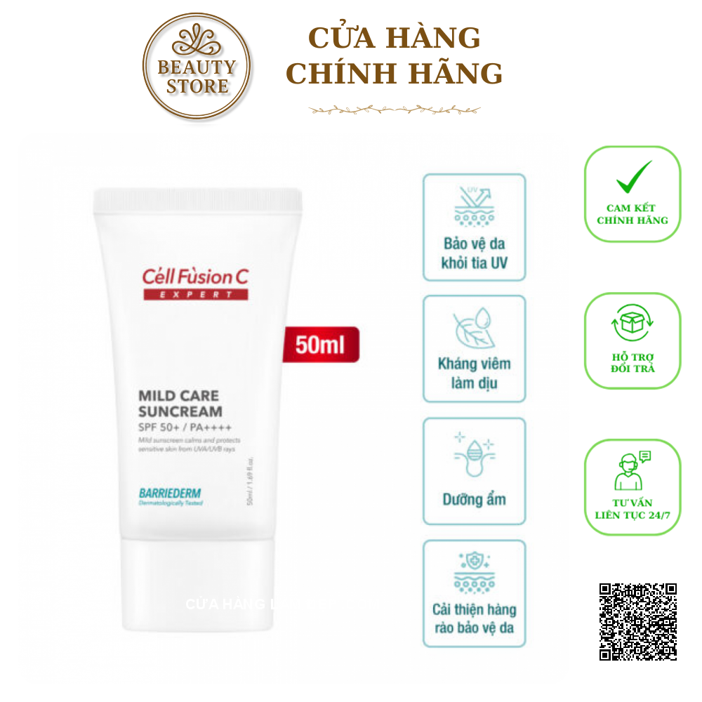 Kem hỗ trợ Hỗ Trợ Chống Nắng Vật Lý Tăng Cường Hàng Rào Bảo Vệ Da Cell Fusion C Expert Barriederm Mild Care Suncream SPF 50+/ PA++++ là sản phẩm hỗ trợ Hỗ Trợ Chống nắng chuyên biệt đến từ thương hiệu dược mỹ phẩm Cell Fusion C của Hàn Quốc, nổi tiếng với các dòng sản phẩm an toàn cho da nhạy cảm và da đang điều giảm. Sản phẩm sử dụng màng lọc vật lý 100% Zinc Oxide giúp bảo vệ da toàn diện khỏi tia UVA/UVB, đồng thời tăng cường hàng rào bảo vệ da, giảm kích ứng và hỗ trợ phục hồi da tổn thương.