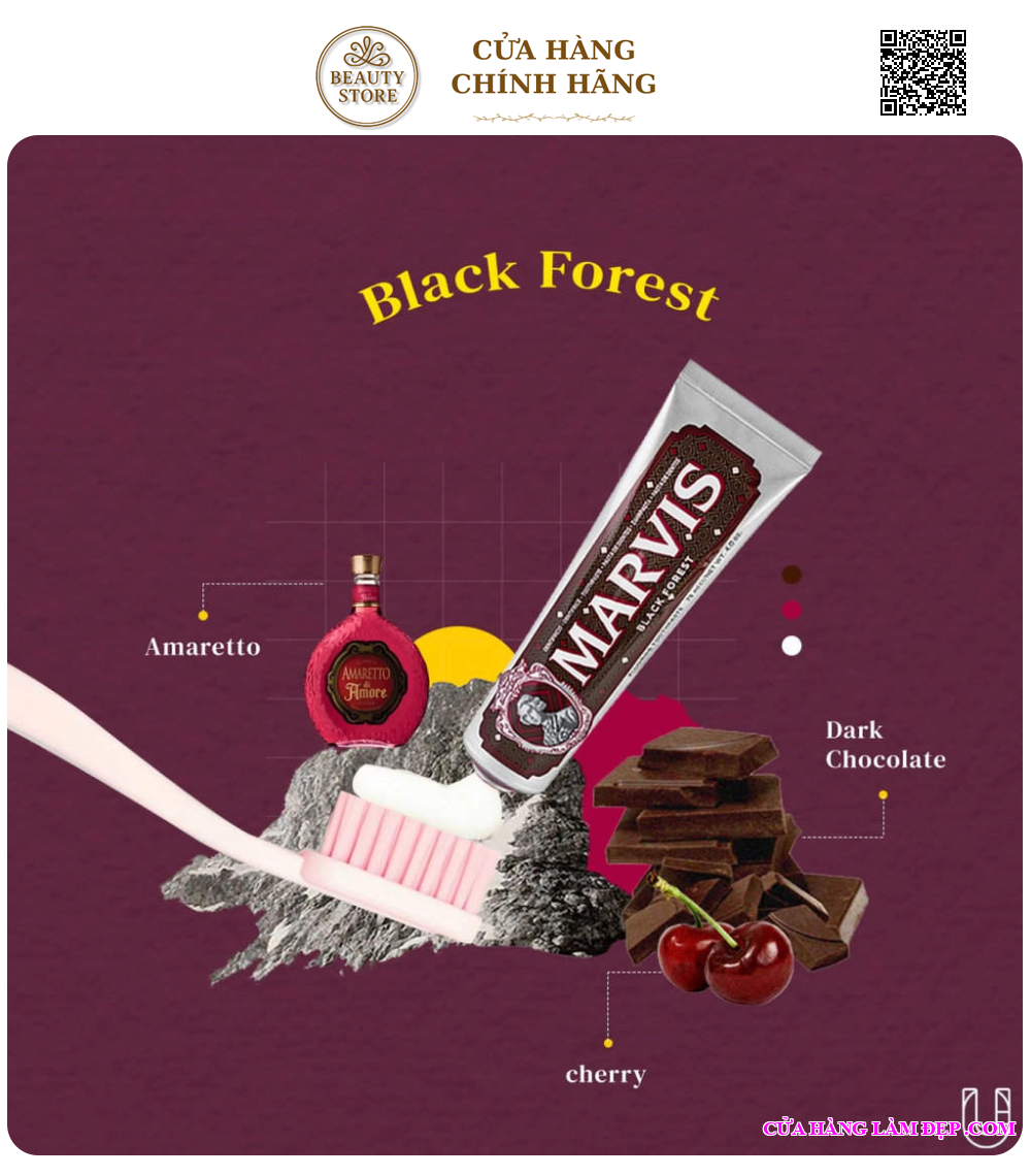 Mùi hương của Marvis Black Forest là sự kết hợp của hương vị ngọt ngào của quả anh đào, kết hợp với vị ấm áp của socola đen. Hậu vị có chút the mát của bạc hà, mang đến 1 trải nghiệm hoàn hảo khi bạn chăm sóc răng miệng.