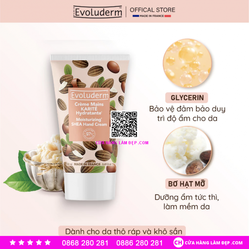 Kem Dưỡng Da Tay Evoluderm Shea là sản phẩm chăm sóc da tay đến từ thương hiệu mỹ phẩm Pháp Evoluderm, nổi tiếng với các công thức thuần chay, lành tính và hiệu quả. Với chiết xuất từ bơ hạt mỡ (Shea Butter) – thành phần dưỡng ẩm tự nhiên giàu vitamin và axit béo, sản phẩm giúp làm mềm, phục hồi và bảo vệ da tay khỏi tình trạng khô ráp, nứt nẻ.