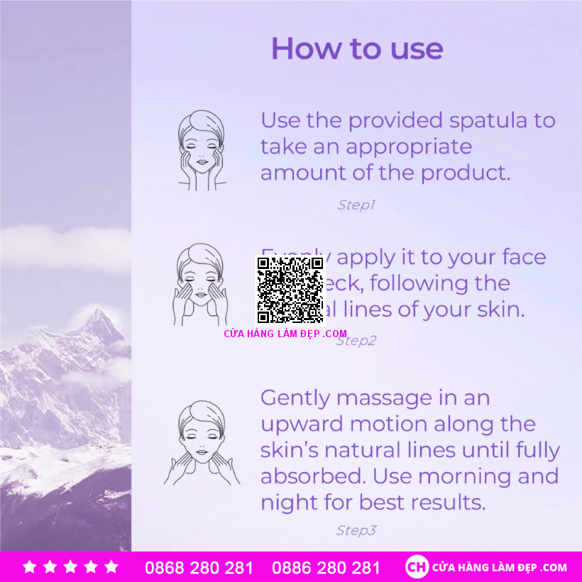 Bước 3: Nhẹ nhàng massage theo chuyển động tròn hướng lên trên cho đến khi thẩm thấu hoàn toàn. Sử dụng vào buổi sáng và buổi tối để có kết quả tốt nhất.
