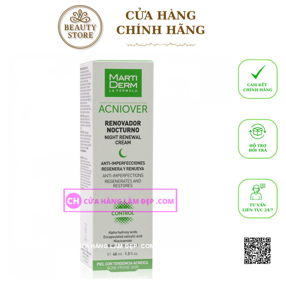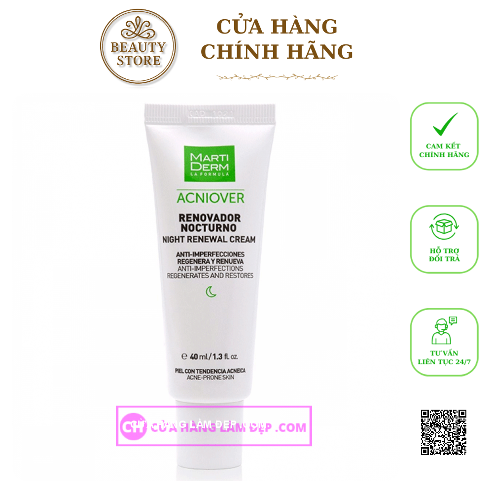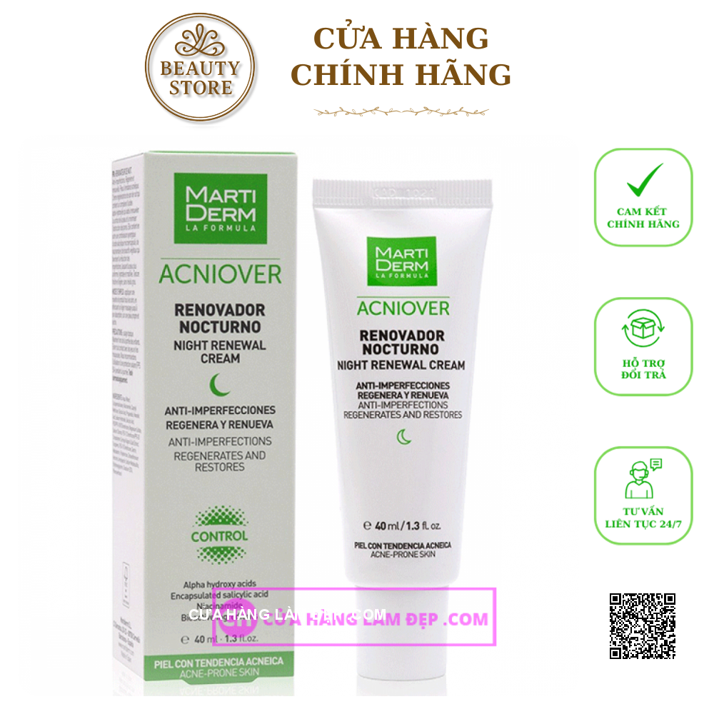 - MartiDerm Acniover Night Renewal Cream là kem dưỡng ban đêm dành cho da dầu mụn, giúp kích thích tái tạo Tinh chất da mới, làm giảm các nhược điểm và thu nhỏ lỗ chân lông, mang đến một làn da tươi sáng, mịn màng và sạch thoáng hơn.