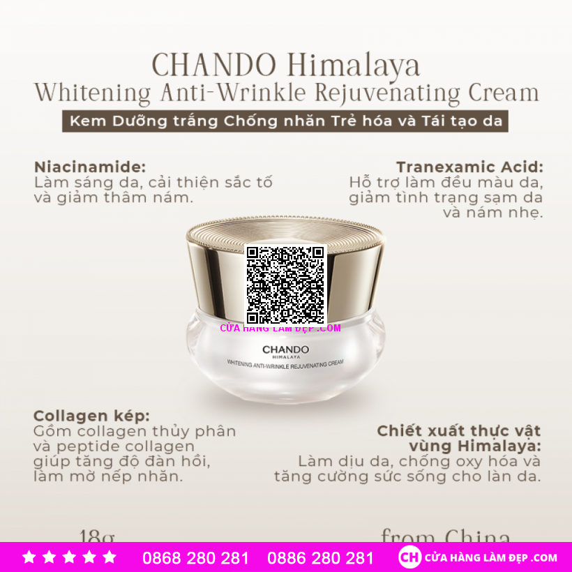 Kem Dưỡng Trắng CHANDO Himalaya Whitening Anti-Wrinkle Rejuvenating Cream hỗ trợ ngừa Nhăn Đẹp Da Và Tái Tạo Da 18g Từ Trung Quốc được khách hàng của Hệ Thống Cửa Hàng Làm Đẹp đánh giá cao.