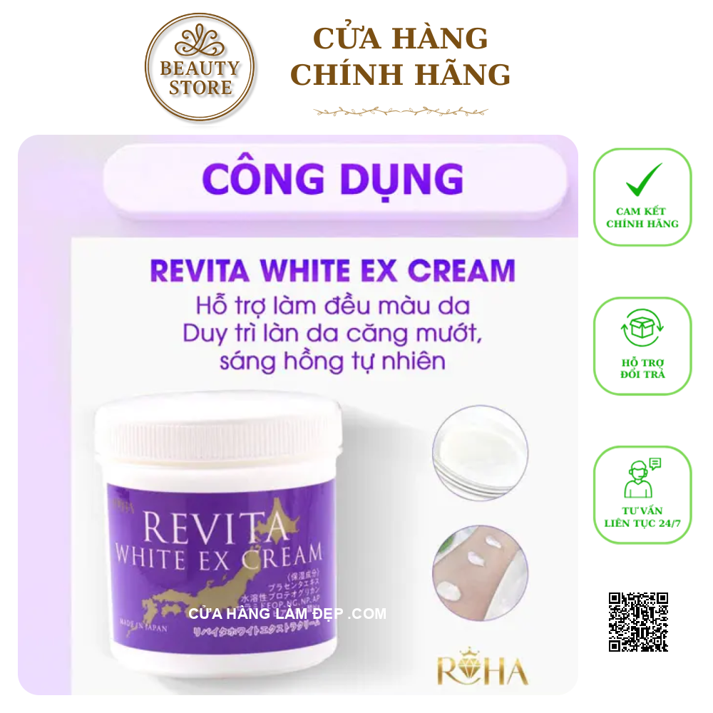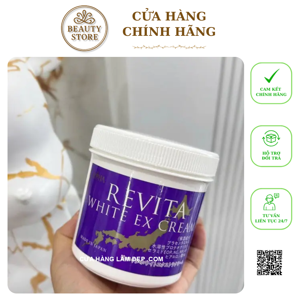 Revita White Ex Cream là dòng kem dưỡng thể đến từ thương hiệu ROHA – Nhật Bản, nổi bật với công thức dưỡng trắng chuyên sâu kết hợp Vitamin C, Collagen thủy phân và chiết xuất thảo dược thiên nhiên. Sản phẩm giúp cải thiện sắc tố da, cấp ẩm sâu và bảo vệ da khỏi các tác nhân gây hại từ môi trường như bụi bẩn, tia UV, ô nhiễm.