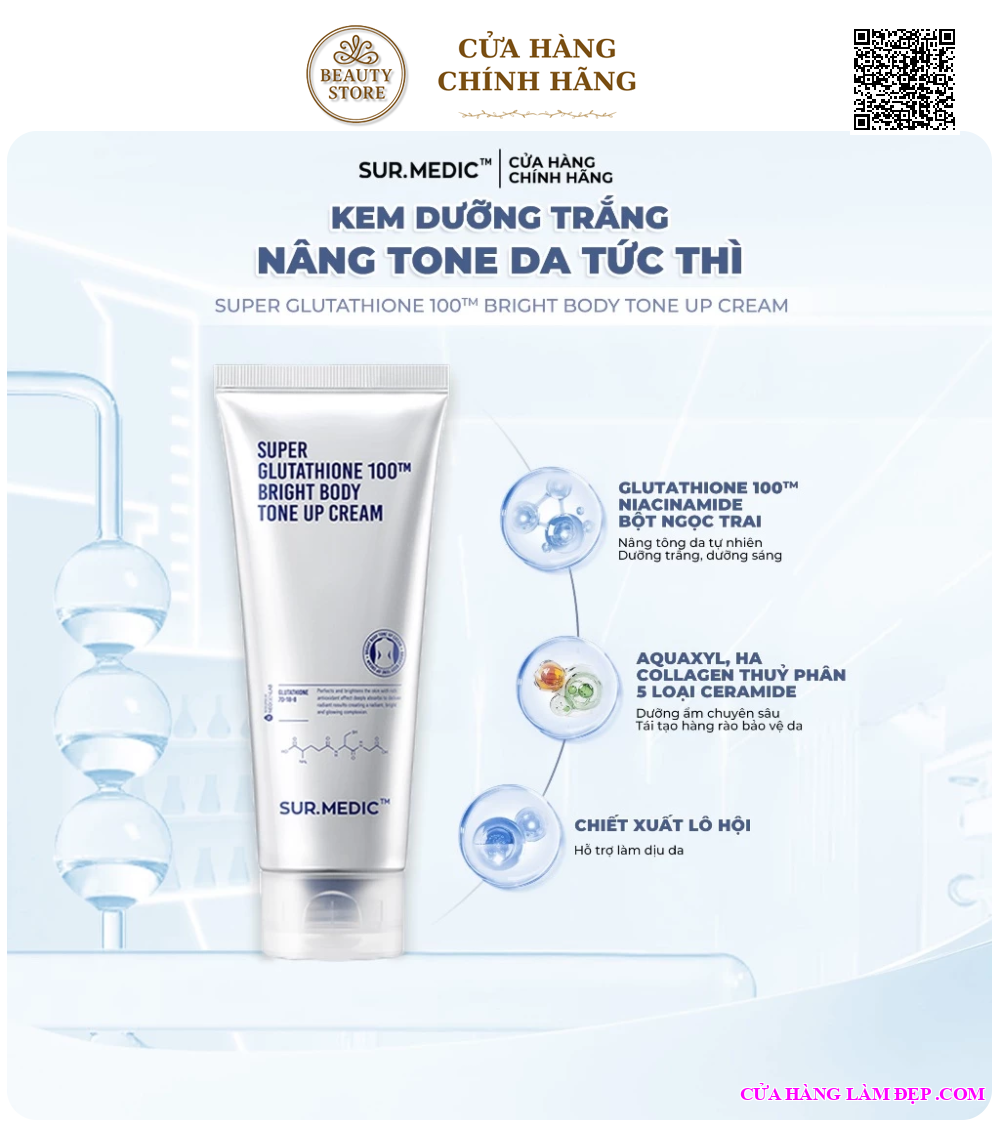 Nếu bạn đang tìm kiếm một sản phẩm dưỡng thể vừa giúp làn da sáng mịn, vừa mang lại hiệu ứng nâng tone tự nhiên thì SUR.MEDIC Super Glutathione 100™ Bright Body Tone Up Cream chính là “người bạn đồng hành” lý tưởng. Đến từ thương hiệu mỹ phẩm Hàn Quốc SUR.MEDIC, sản phẩm này kết hợp giữa Glutathione – hoạt chất làm trắng nổi bật – cùng các dưỡng chất phục hồi, giúp làn da không chỉ sáng lên tức thì mà còn khỏe mạnh từ bên trong.