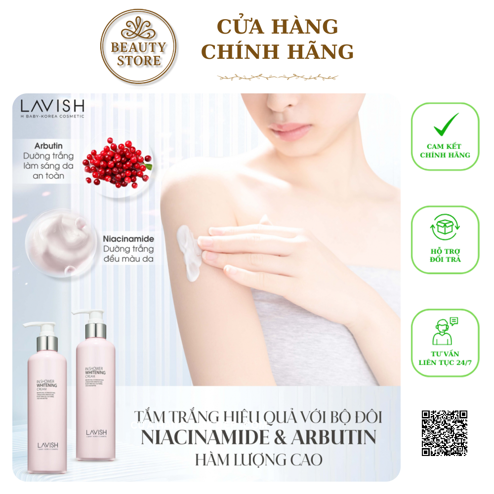 Kem Tắm Trắng Chuyên Sâu Dành Cho Body In Shower Whitening Cream Lavish H Baby với thành phần được chiết xuất từ thiên nhiên cùng hoạt chất vi lượng siêu trắng Arbutin, Niacinamide giúp cải thiện ngay làn da đen sạm, tối màu chỉ sau 20 phút: