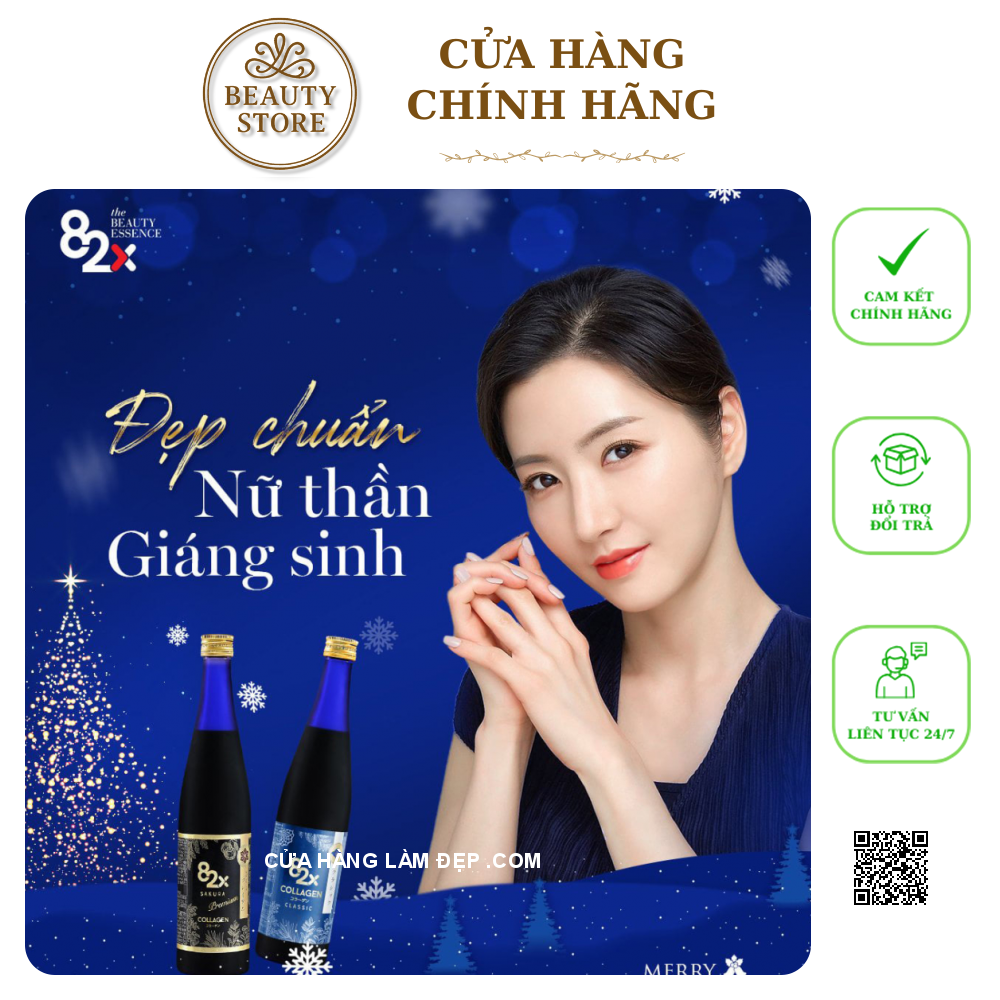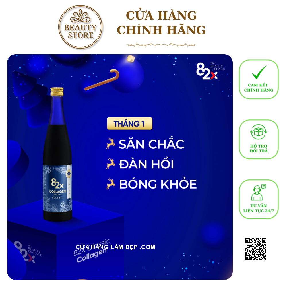 - Khả năng TRẺ HÓA DA TỰ NHIÊN: Với 120.000mg Collagen peptide cao nhất thị trường hiện nay; cùng 1.000mg chiết xuất hoa Anh đào và các dưỡng chất cao cấp Elastin, tơ thủy phân, sữa ong chúa,... 82X Collagen tăng cường hỗ trợ ngừa lão hóa, làm giảm nếp nhăn, chùng nhão, mang đến làn da mềm mại, bóng khỏe.