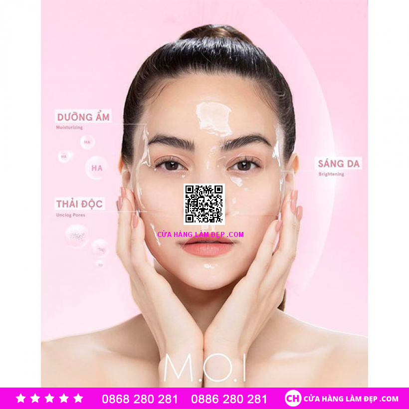 -Mặt nạ đến từ M.O.I Cosmetics là dạng hydrogel đặc biệt trông giống như thạch, có tác dụng dưỡng da, làm sáng, tăng độ đàn hồi, phù hợp với da thiếu độ ẩm, xỉn màu, thiếu sức sống, đang bị lão hóa. Đồng thời giải quyết nhiều vấn đề về da của người châu Á, đặc biệt là phụ nữ Việt Nam. -Khi sử dụng ngay từ miếng mặt nạ đầu tiên, chắc chắn bạn sẽ thấy được làn da có nhiều chuyển biến tích cực: sáng hơn, ẩm hơn và các lỗ chân lông nhỏ đi so với trước khi đắp mặt nạ. Dùng cho đến hết miếng thứ 3 da sẽ được thải hết độc tố và ngậm nước mướt mượt. Đây cũng chính là lý do vì sao 1 hộp sản phẩm lại chứa 3 miếng mặt nạ chứ không bán lẻ như các sản phẩm mặt nạ khác.