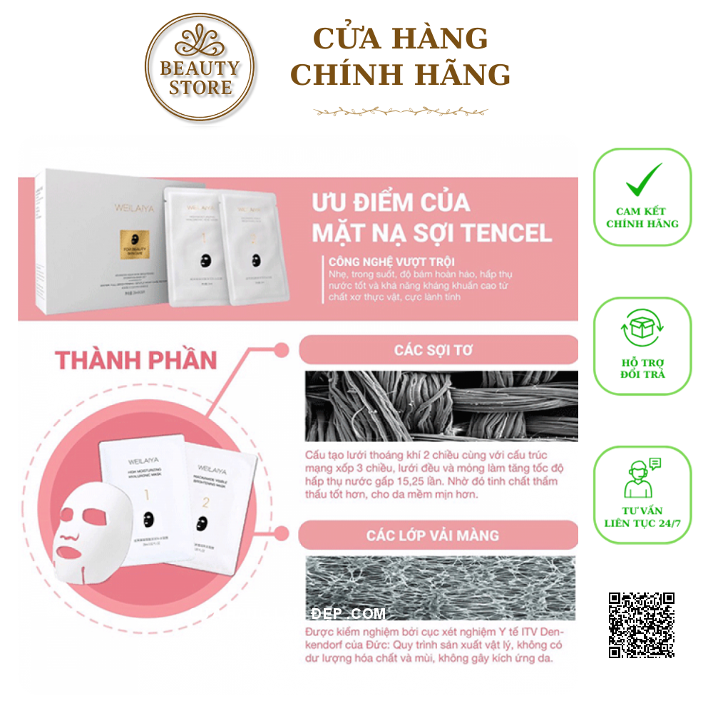 - Mặt Nạ Hoàng Gia Advanced Aqua-Mask Brightening Hydration Mask Set Weilaiya làm từ chất liệu sợi tencel với cấu tạo lưới thoáng khí 2 chiều cùng với cấu trúc mạng xốp 3 chiều giúp mặt nạ có khả năng thẩm thấu tốt hơn.