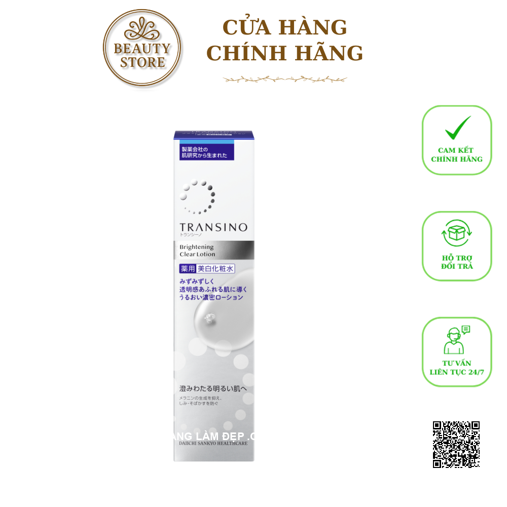 TRANSINO Brightening Clear Lotion là nước hoa hồng dưỡng trắng và dưỡng ẩm cao cấp đến từ thương hiệu dược mỹ phẩm Nhật Bản Daiichi Sankyo Healthcare. Sản phẩm được nghiên cứu chuyên sâu để cải thiện tình trạng da khô, xỉn màu, không đều màu, nám và tàn nhang.
