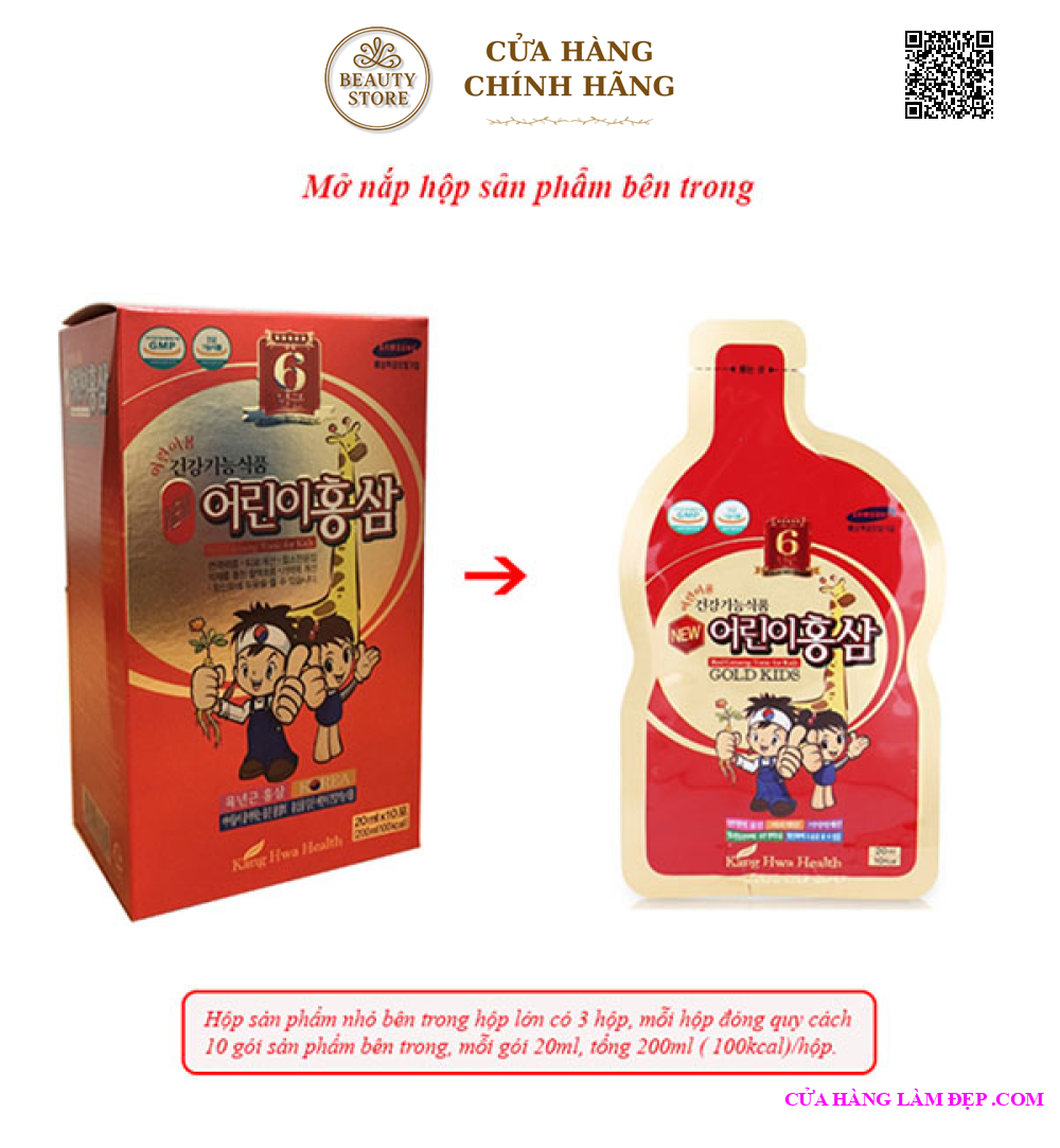 - Với chiết xuất hồng sâm hàn quốc 6 năm tuổi nguyên chất 100%, đặc biệt bổ sung thêm canxi và hương hoa quả đặc biệt thơm ngon.