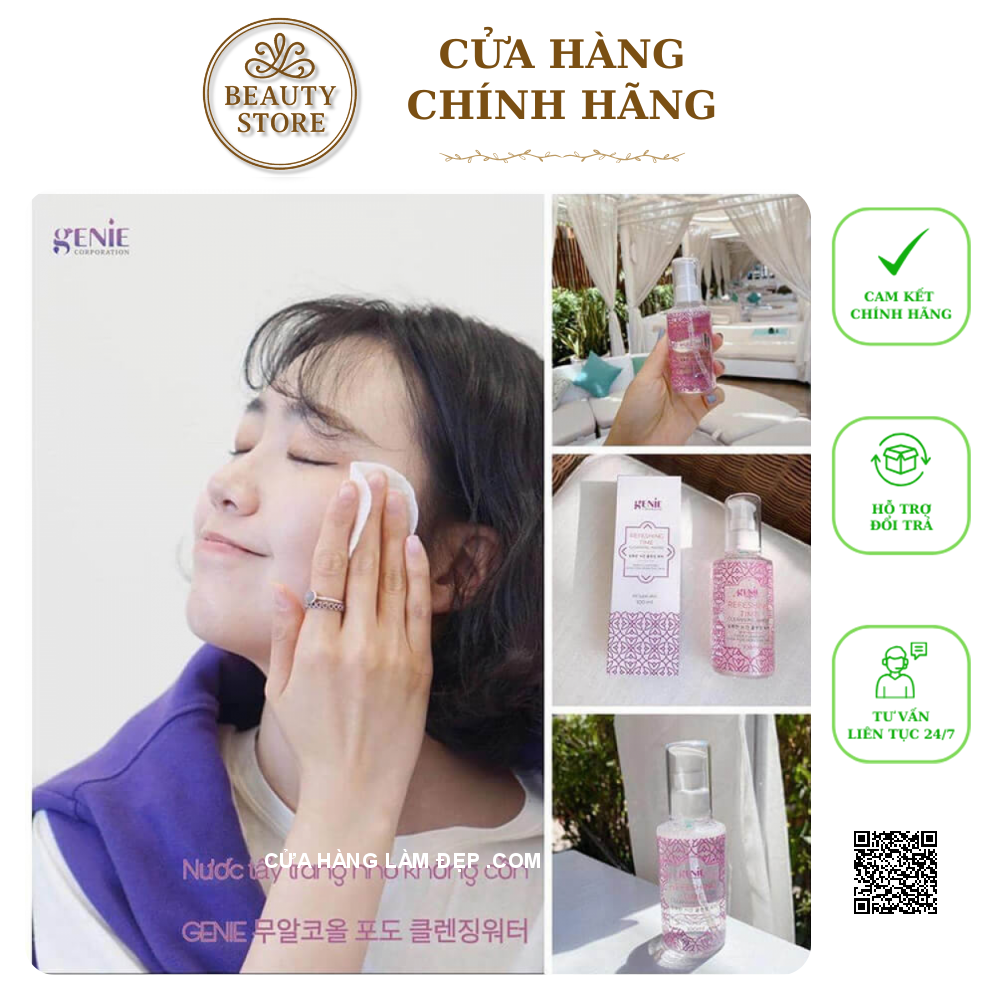 - Nước tẩy trang Genie làm sạch da từ những lớp kem nền , phấn mắt cho đến son lì kẻ mắt .