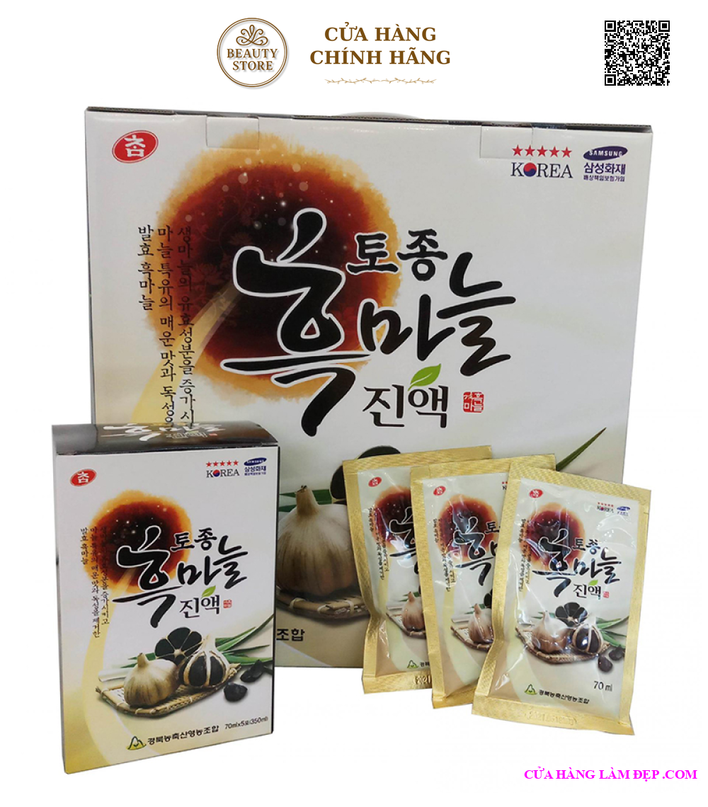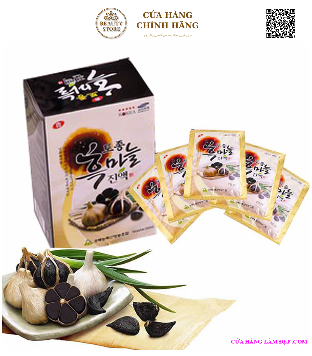 - Chiết xuất tỏi đen hàn quốc (thành phần rắn 4%) chiếm 90%, táo đỏ hàn quốc, quả hovenia dulcis, thủy phân tinh bột dextrin, đường oligosaccharides, đường Fructose. - Tinh chất tỏi đen hàn quốc là tỏi được lên men từ tỏi thường trong một thời gian dài. Tỏi đen có màu đen, vị ngọt, không còn mùi cay hăng của tỏi thường; có tác dụng gấp hàng chục lần tỏi thường. - Tỏi đen sau khi lên men thì hàm lượng các nhóm hoạt chất tăng lên rất cao; đặc biệt hàm lượng S-allyl, L-Cystein (là hoạt chất có tác dụng ngăn ngừa sự phát sinh của các khối u). Ở các nước Hàn Quốc, Nhật Bản và Úc tỏi đen được sử dụng rộng rãi với vai trò chống ôxy hóa rất cao; là một loại thực phẩm giúp tăng cường sức khỏe.