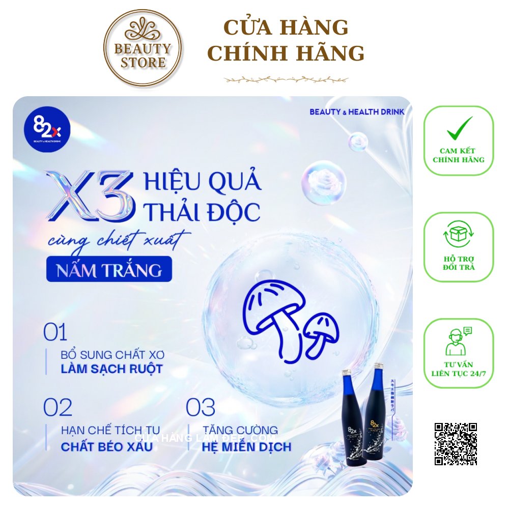 - 82X FCD Collagen bổ sung tổ hợp “chiết xuất 82 thực vật lên men + chiết xuất Nấm trắng” giúp nhân đôi hiệu quả miễn dịch và thải độc cho cơ thể.