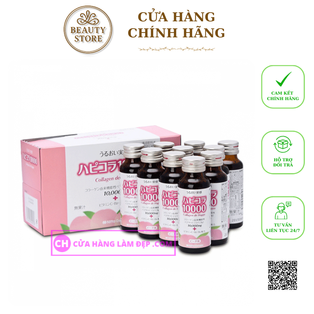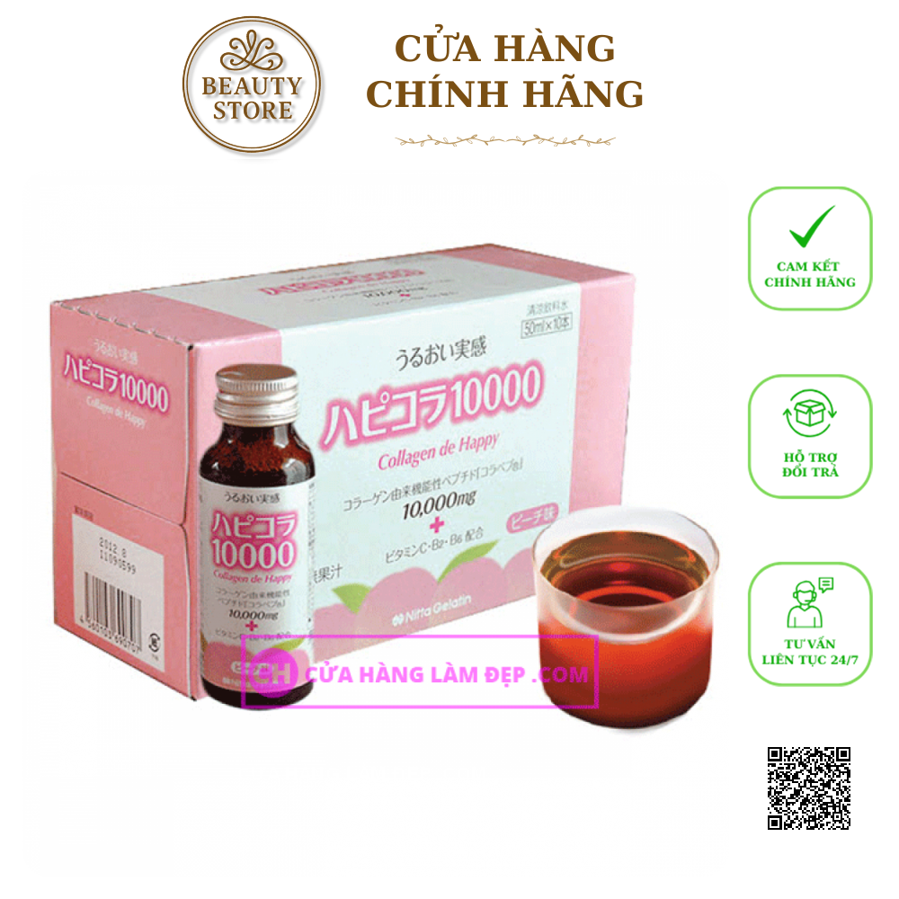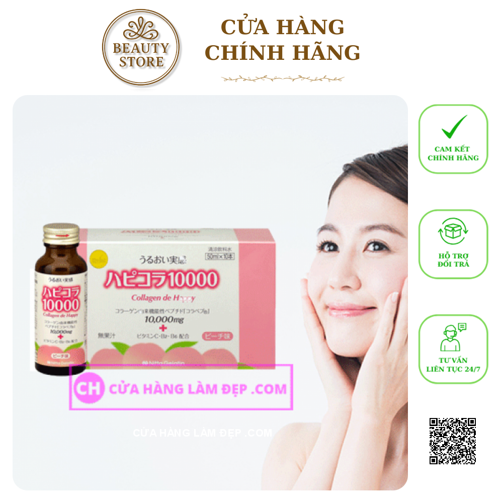 Collagen de Happy Bổ sung 10,000mg Collagen Peptide còn nguồn gốc từ heo có khả năng hấp thụ cao, không chỉ mang lại độ săn chắc và độ ẩm cho da mà còn được xác nhận là có tác dụng cải thiện bệnh khớp và loãng xương. Đặc biệt, nước uống có vị chua ngọt, thanh mát của đào, không nhiều calo nên người giảm cân có thể dùng được.