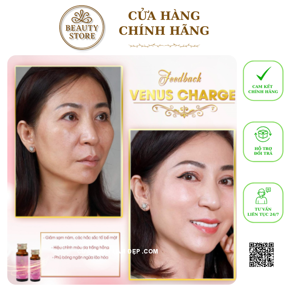 - Venus Charge cung cấp và bổ sung nhanh lượng Collagen thiếu hụt trong cơ thể, cải thiện hiệu quả tình trạng da kém sắc, không đều màu, khô ráp, sần sùi, dễ hình thành các nếp nhăn, chân chim ở đuôi mắt và khóe miệng.