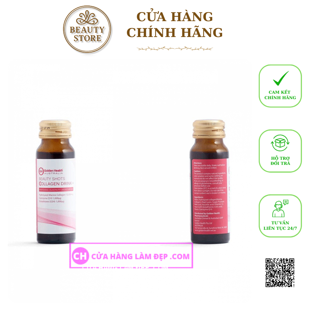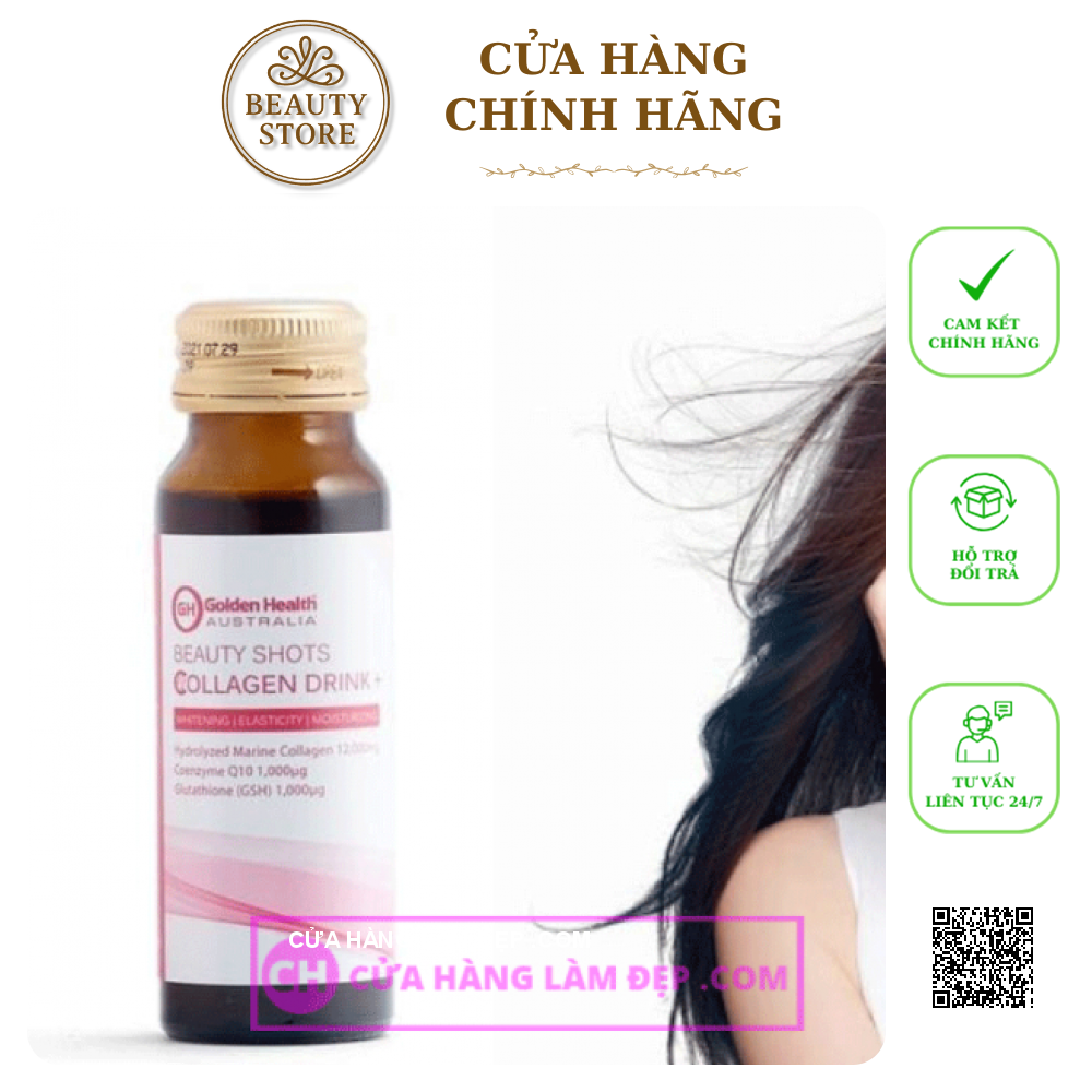 - Nước Uống Golden Health Beauty Shots Collagen Drink + là sản phẩm làm đẹp, bổ sung collagen đến từ thương hiệu Golden Health nổi tiếng của Úc. Nước uống đẹp da Beauty Shots Collagen là cái tên rất được ưa chuộng nhờ hàm lượng collagen dồi dào, cao nhất trong các dòng sản phẩm bổ sung collagen trên thị trường (lên đến 12.000mg).