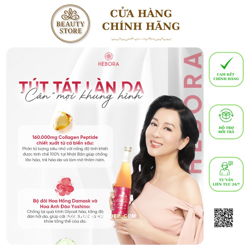 - Đã đẹp lại còn lưu hương thơm quyến rũ tự thân, với công thức làm đẹp tự nhiên và đẳng cấp của Nước Uống Collagen Enrich Hebora. Nước uống kết hợp độc đáo giữa hàm lượng cao collagen, dưỡng da săn chắc, cùng tinh chất hoa hồng Damask giúp thanh lọc cơ thể, lưu hương thơm đầy tinh tế và quyến rũ.