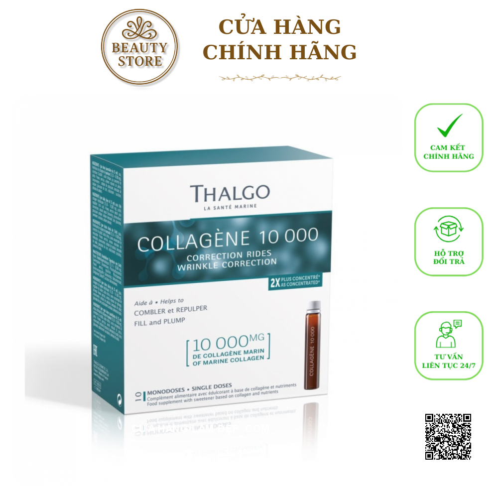 - Nước Uống Thalgo Collagen 10000 chứ đến 10.000 mg collagen biển, sẽ phục hồi làn da chảy xệ và lỏng lẻo, giúp da căng mịn và đàn hồi để xóa mờ nhanh chóng các nếp nhăn trên da, giữ da luôn tươi trẻ và căng tràn sức sống.