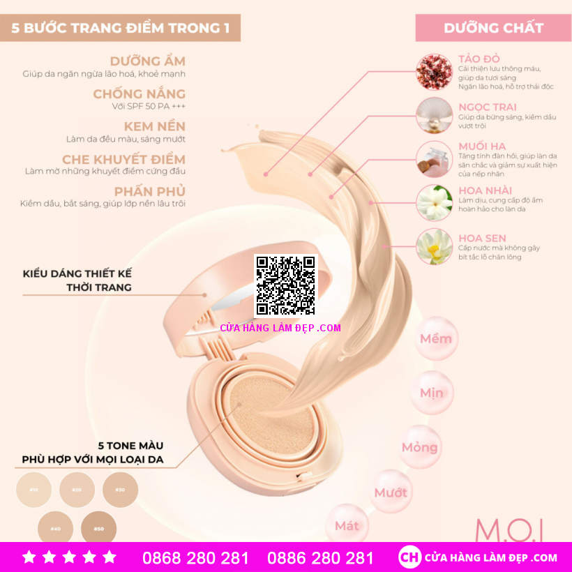- Phấn Nước MOI Baby Skin Cushion tiện ích 5 trong 1 với độ che phủ hoàn hảo hơn bởi kết cấu mỏng mịn, ôm khít vào bề mặt da cho lớp nền tự nhiên, mỏng mịn và căng mướt như làn da em bé.