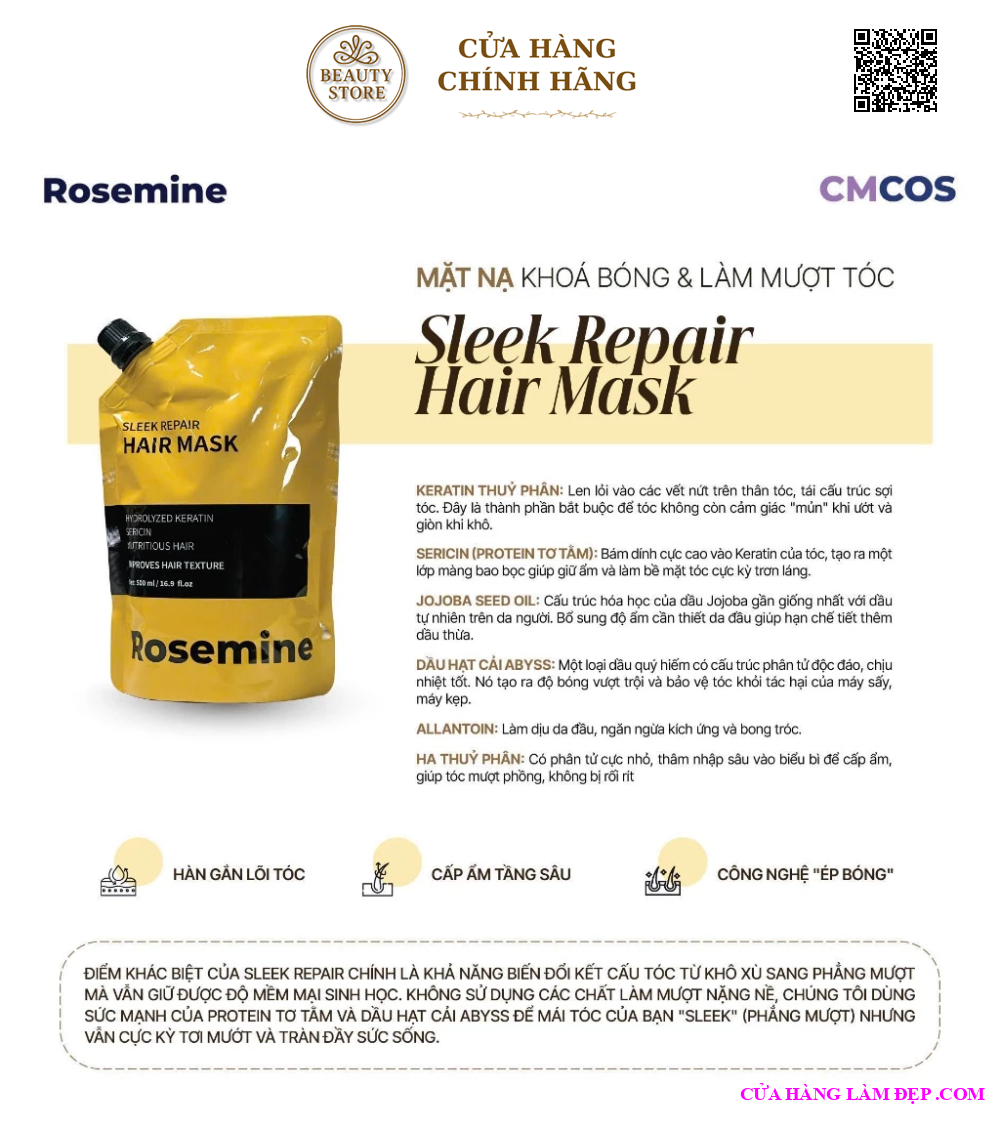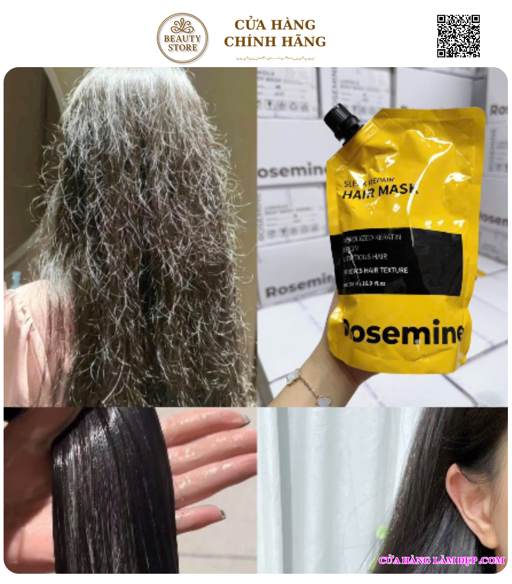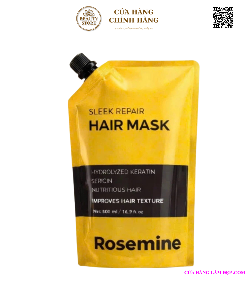 Kem ủ tóc Rosemine là dòng chăm sóc tóc chuyên sâu giúp phục hồi tóc khô xơ, hư tổn do uốn – nhuộm – nhiệt. Với công thức chứa keratin và collagen thủy phân, sản phẩm giúp nuôi dưỡng tóc từ bên trong, mang lại mái tóc mềm mượt, bóng khỏe và dễ vào nếp.