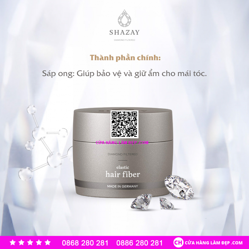 - Giữ nếp ổn định, định hình phong cách: Sáp tạo kiểu tóc Shazay Elastic Hair Fiber với sự kết hợp giữa nước lọc kim cương và sáp ong mang lại trải nghiệm tuyệt vời với khả năng giữ nếp ổn định suốt ngày dài, linh hoạt từng lọn tóc, mái tóc dẻo dai, không bết dính và bóng mượt tự nhiên.