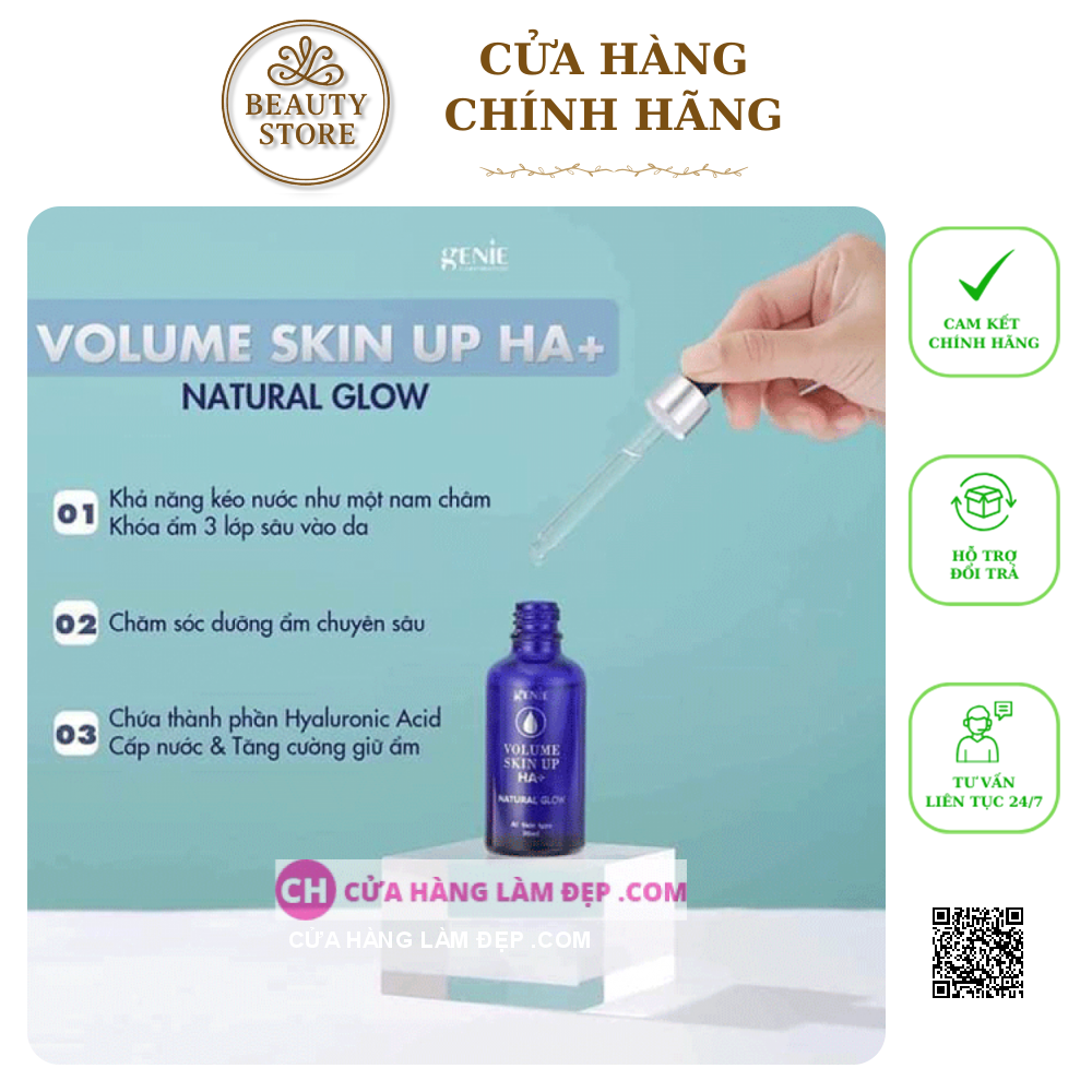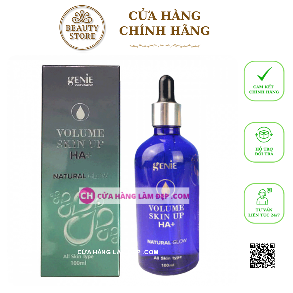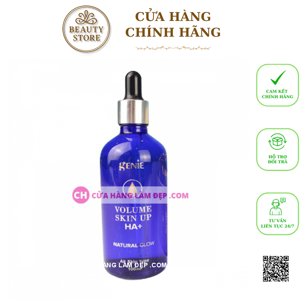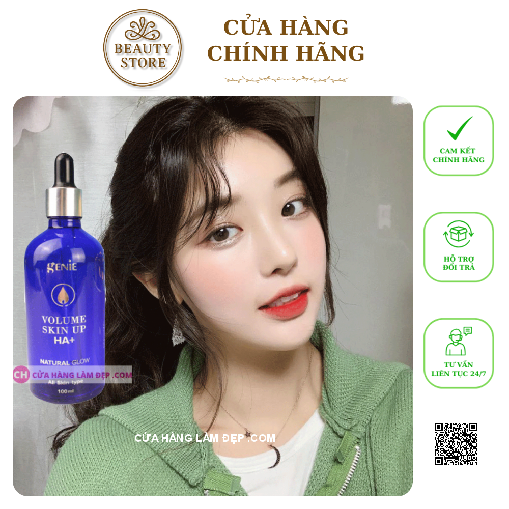 - Serum Dưỡng Ẩm Genie Natural Glow Volume Skin Up HA+ là một sản phẩm được tinh chế từ 100% nước Hyaluronic Acid và các siêu dưỡng chất quý giá, giúp bù nước hiệu quả cho làn da thiếu ẩm. Sản phẩm được nghiên cứu bởi Viện Nghiên cứu mô da con người Asian hợp tác với Tập đoàn mỹ phẩm danh tiếng Hàn Quốc DB Group. Với thành phần HA+, Serum Volume Skin Up HA+ hoạt động như hoạt chất giữ ẩm Hyaluronic Acid và điều lượng dầu nhờn trên da, khắc phục mọi vấn đề về da mà nguyên nhân xuất phát từ việc thiếu hụt nước bao gồm khô sạm, bóng dầu, sần sùi, mụn nám.