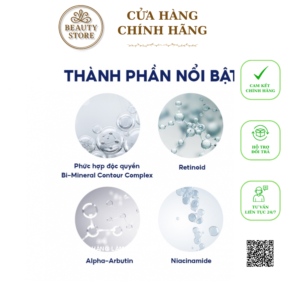 - Phức hợp độc quyền Bi-Mineral Contour Complex: Củng cố các giai đoạn quan trọng trong quá trình sản xuất elastin, cải thiện chất lượng elastin, giải quyết tình trạng da chùng nhão, các rãnh nhăn.