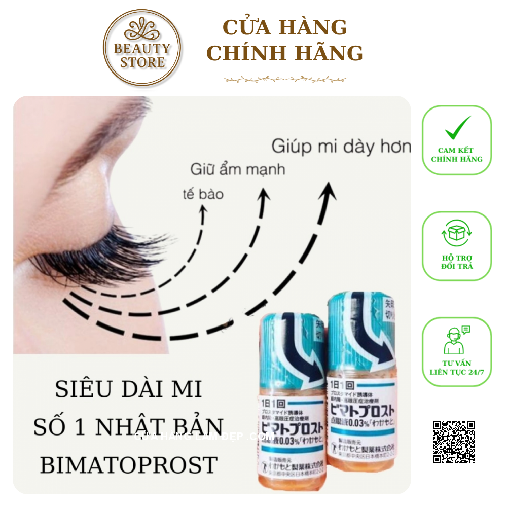 - Tinh chất dưỡng dài mi Bimatoprost là sản phẩm có xuất xứ từ Nhật Bản, với thành phần chứa dược chất Bimatoprost – là dược chất duy nhất được FDA cấp phép cho sử dụng để làm dài và dày lông mi tự nhiên. Đây được xem là liệu pháp thẩm mỹ giúp dưỡng mi dài, dày và sậm màu hơn cho những người mi ít mi hoặc bị rụng mi.