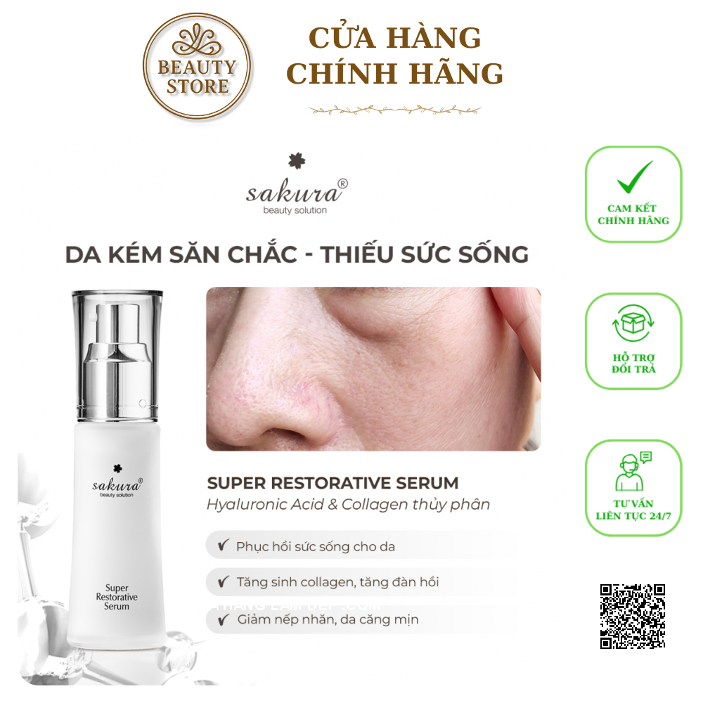 Serum Phục Hồi Da Hỗ Trợ Ngừa Lão Hóa Sakura Super Restorative Serum là sản phẩm ra đời nhằm đáp ứng nhu cầu cả phụ nữ Nhật. Xuất phát từ những nghiên cứu vượt trội cùng quy trình công nghệ sản xuất hiện đại, sự kế hợp của các thành phần tự nhiên đã tạo ra một sản phẩm hàng đầu về bảo vệ làn da. Các công dụng đa năng của sản phẩm phải kế đến đó là bảo vệ da khỏi tác động của môi trường, ánh nắng mặt trời; thẩm thấu nhanh và sâu kích thích tăng trưởng Collagen có trong sản phẩm sẽ giúp da phục hồi độ đàn hồi, dưỡng da săn chắc, căng mịn, làm chậm quá trình lão hóa, xóa mờ nếp nhăn.