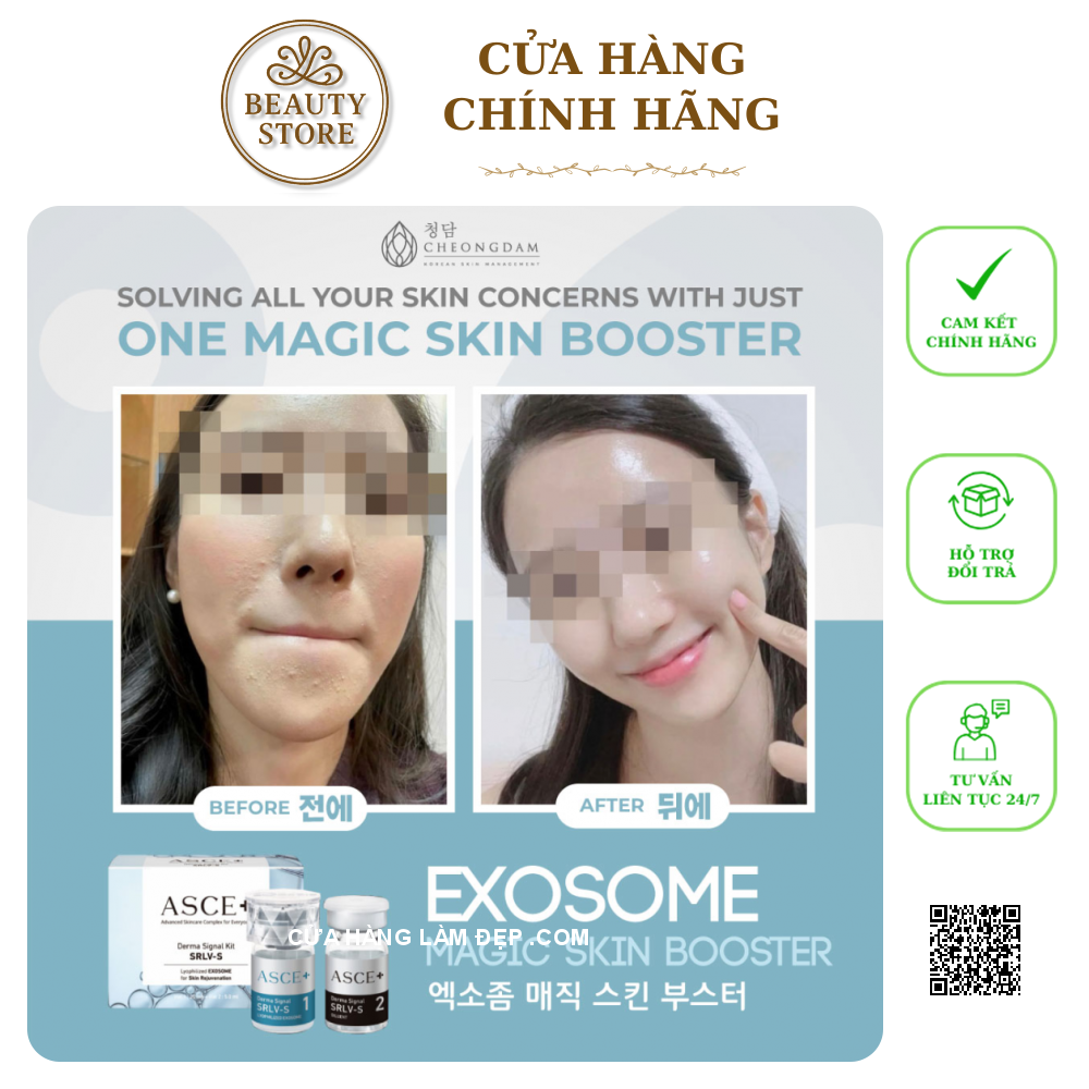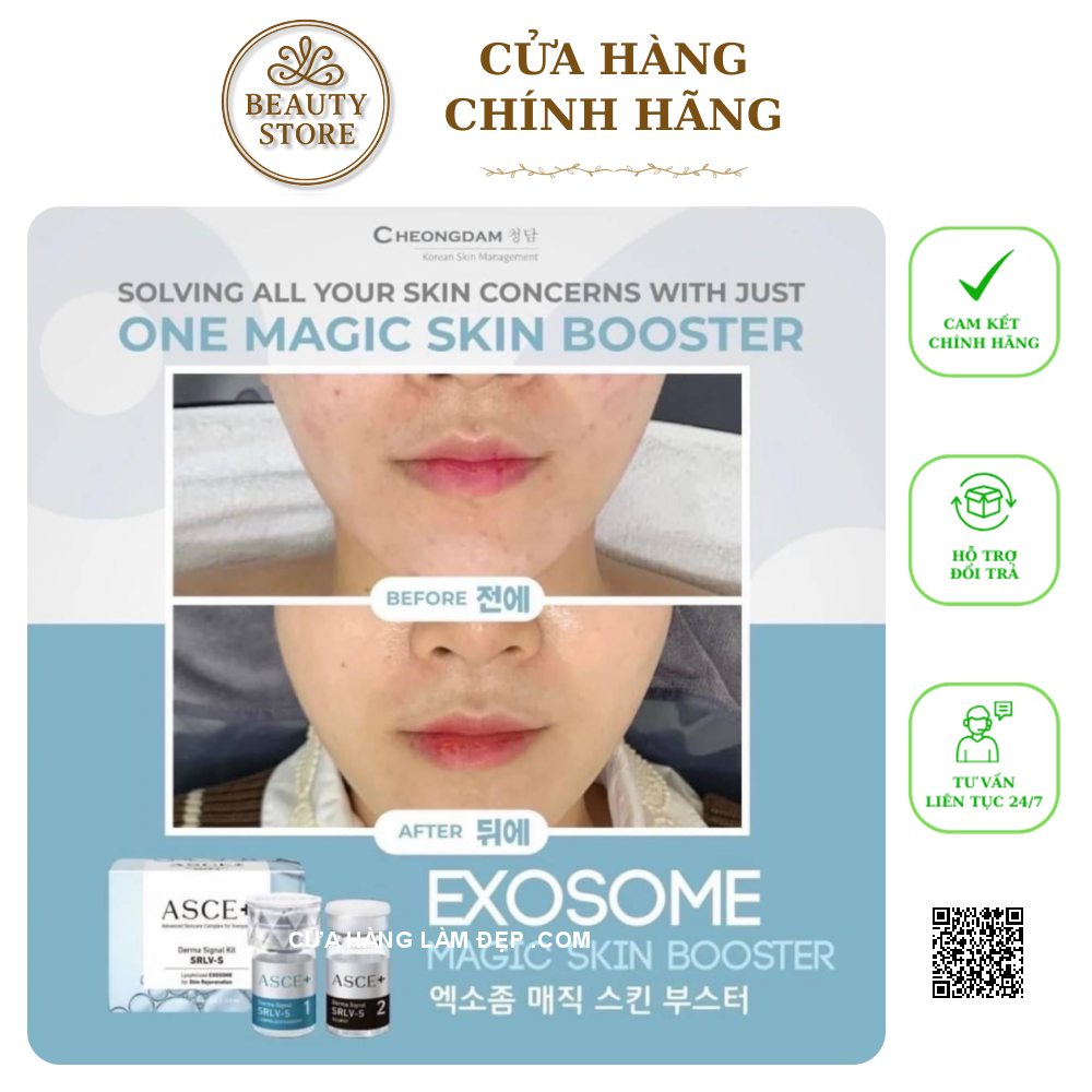Exosome là công nghệ sinh học dẫn đầu trong tái tạo phục hồi da. Liệu pháp cấy tinh chất căng bóng da Tinh Chất Tinh chất Exosome Asce plus Derma Signal Kit khắc phục hầu hết các vấn đề làn da giúp hỗ trợ trẻ hóa, căng bóng, thu nhỏ lỗ chân lông, Mờ Nám, tàn nhang, và kể cả làn da sau khi peel, đỏ ửng do sản phẩm không chất lượng.