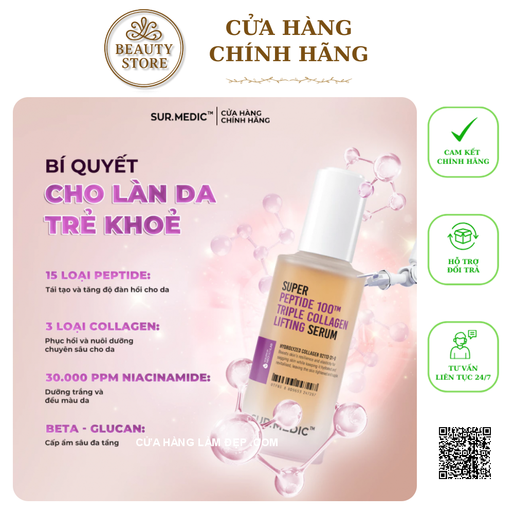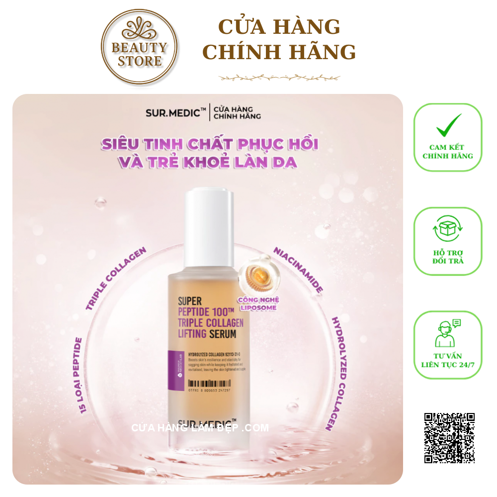 Nếu làn da bạn đang bắt đầu xuất hiện dấu hiệu lão hóa, thiếu săn chắc hay mệt mỏi sau những ngày dài căng thẳng, thì SUR.MEDIC Super Peptide 100TM Collagen Lifting Serum chính là “liều bổ” mà làn da bạn đang cần. Đây là dòng tinh chất phục hồi chuyên sâu đến từ thương hiệu SUR.MEDIC – nổi tiếng với các công thức kết hợp giữa công nghệ sinh học hiện đại và chiết xuất tự nhiên.